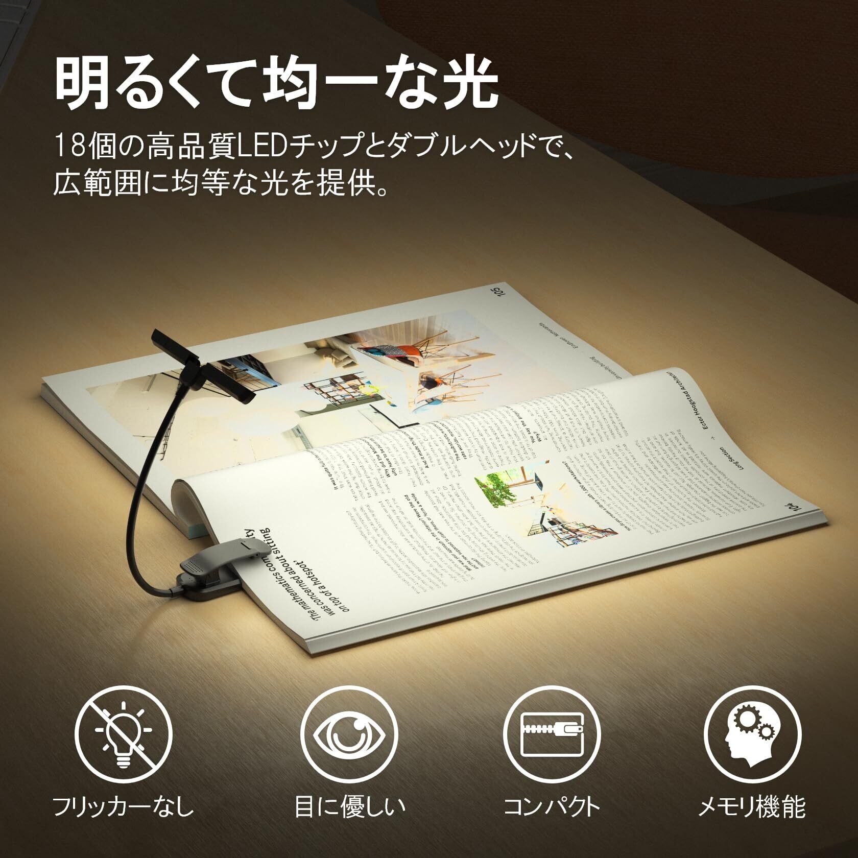 【目に優しい&均一な光】18個の高品質LED発光チップを採用し、明るく均一な光を実現。チラツキのない光で目を守り、長時間の使用でも疲れにくい、快適な読書体験を提供します。