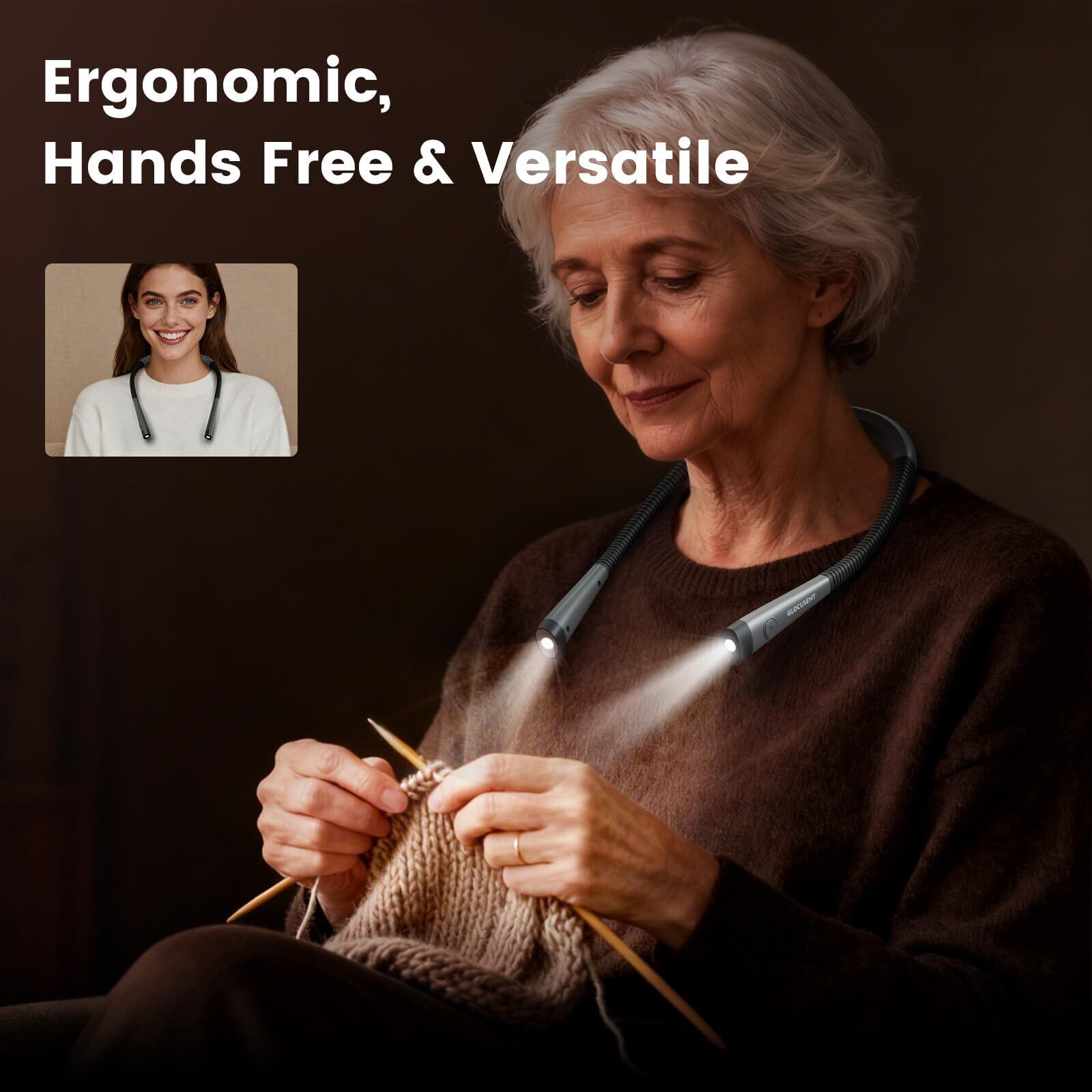 【目に優しいと人間工学デザイン】優良なLEDビーズにより青色光と点滅の現象がないです。目をよく保護することができます。それに、製品のアームはしなやかで調節可能なので、使用時最も快適な角度を得ることができます。重さはわずか131gで、首にかけて両手が自由に使える、便利なハンズフリーライト。