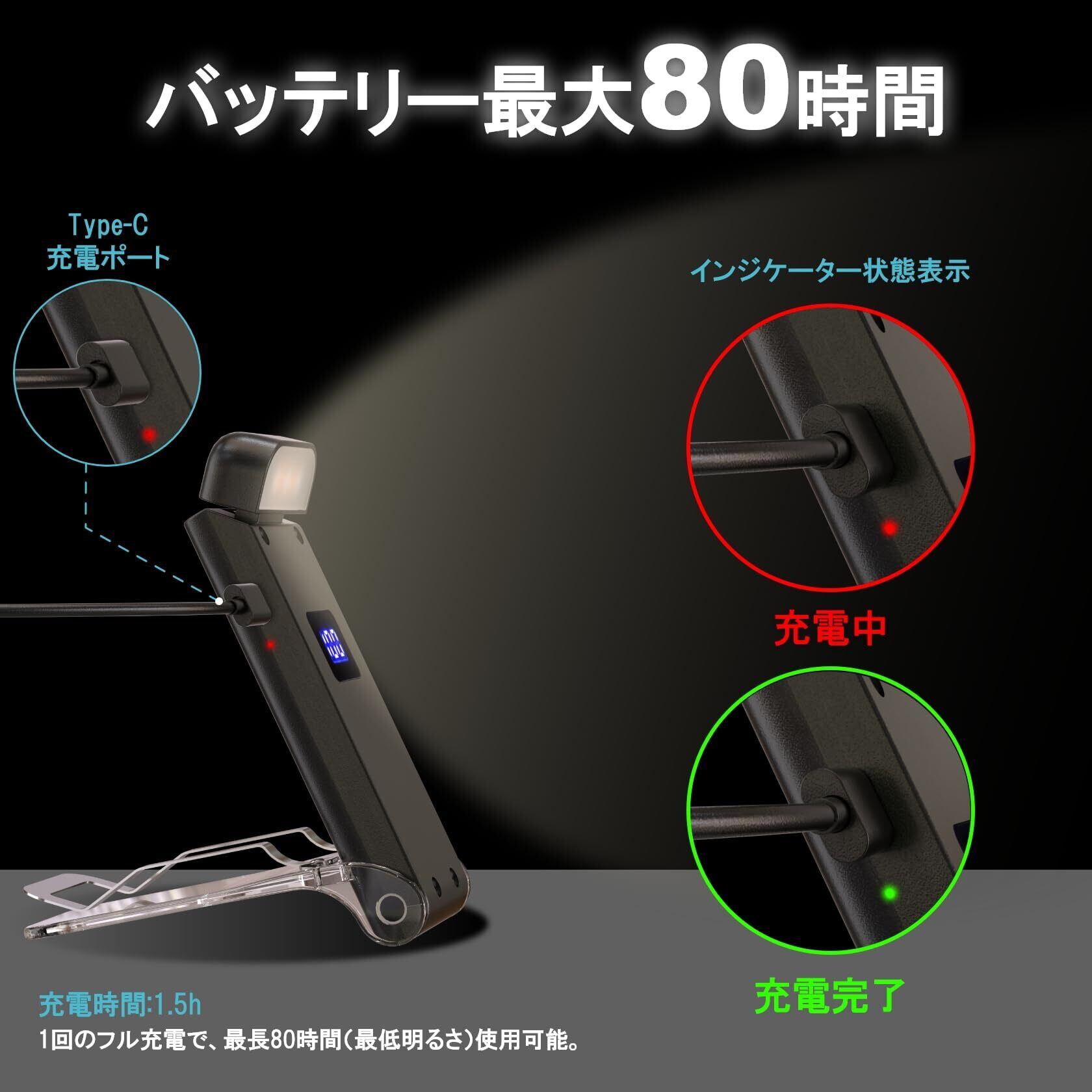 【USB充電で最長80時間】500mAhの内蔵バッテリーで、わずか1.5時間の充電時間でフル充電が可能。最低輝度設定で最大80時間の連続使用ができ、長時間の読書でも安心してご利用いただけます。USB充電対応で、パソコンやアダプター、USBポートから簡単に充電でき、便利で手軽に使えます。
