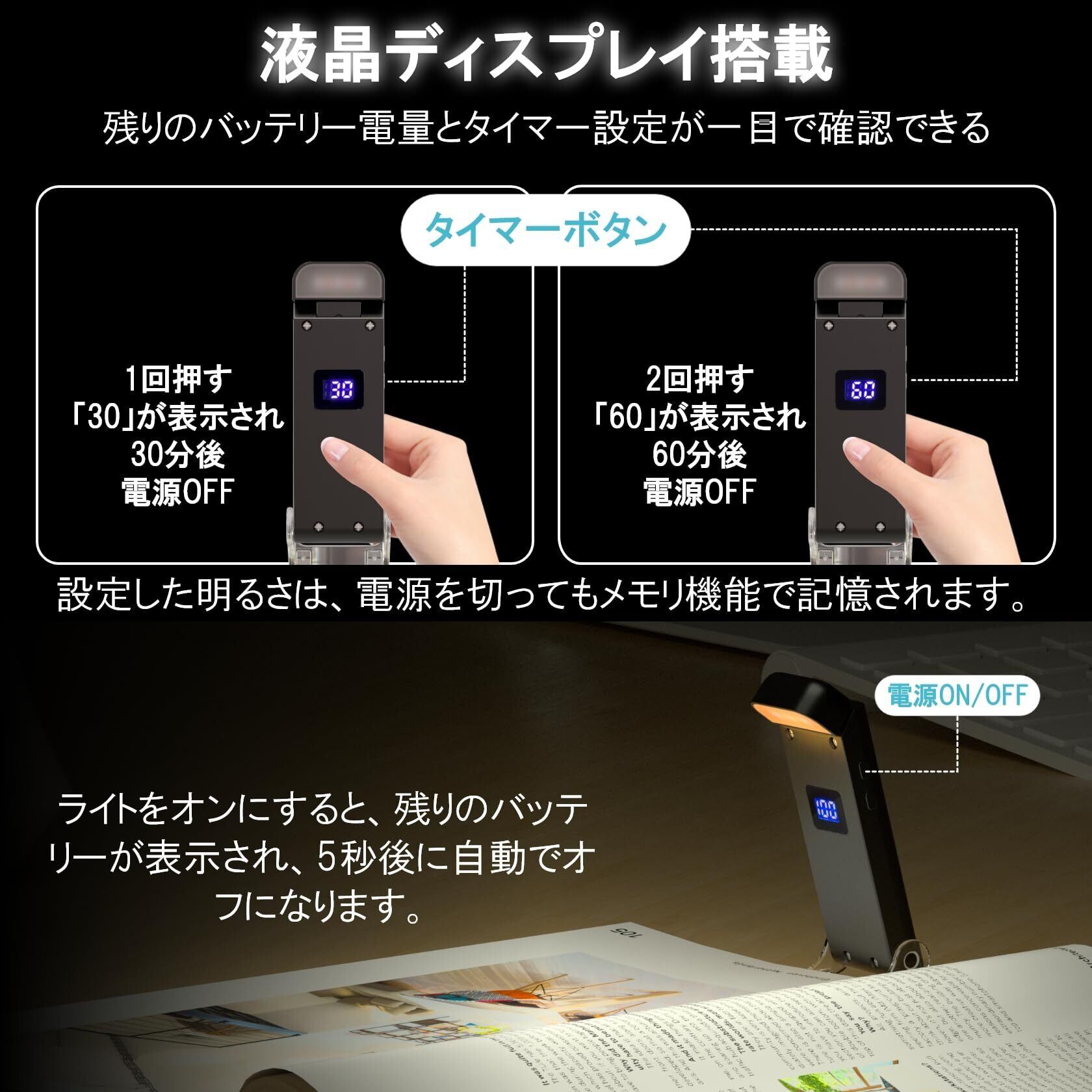読書灯 ブックライト USB充電式 ポータブル 譜面灯 本につける 3段階調色・5段階調光 液晶ディスプレイ画面搭載 30/60分タイマー付き バッテリー残量表示 読書 ライト 小型 軽量 角度調節 夜間読書用 寝室 ブラック