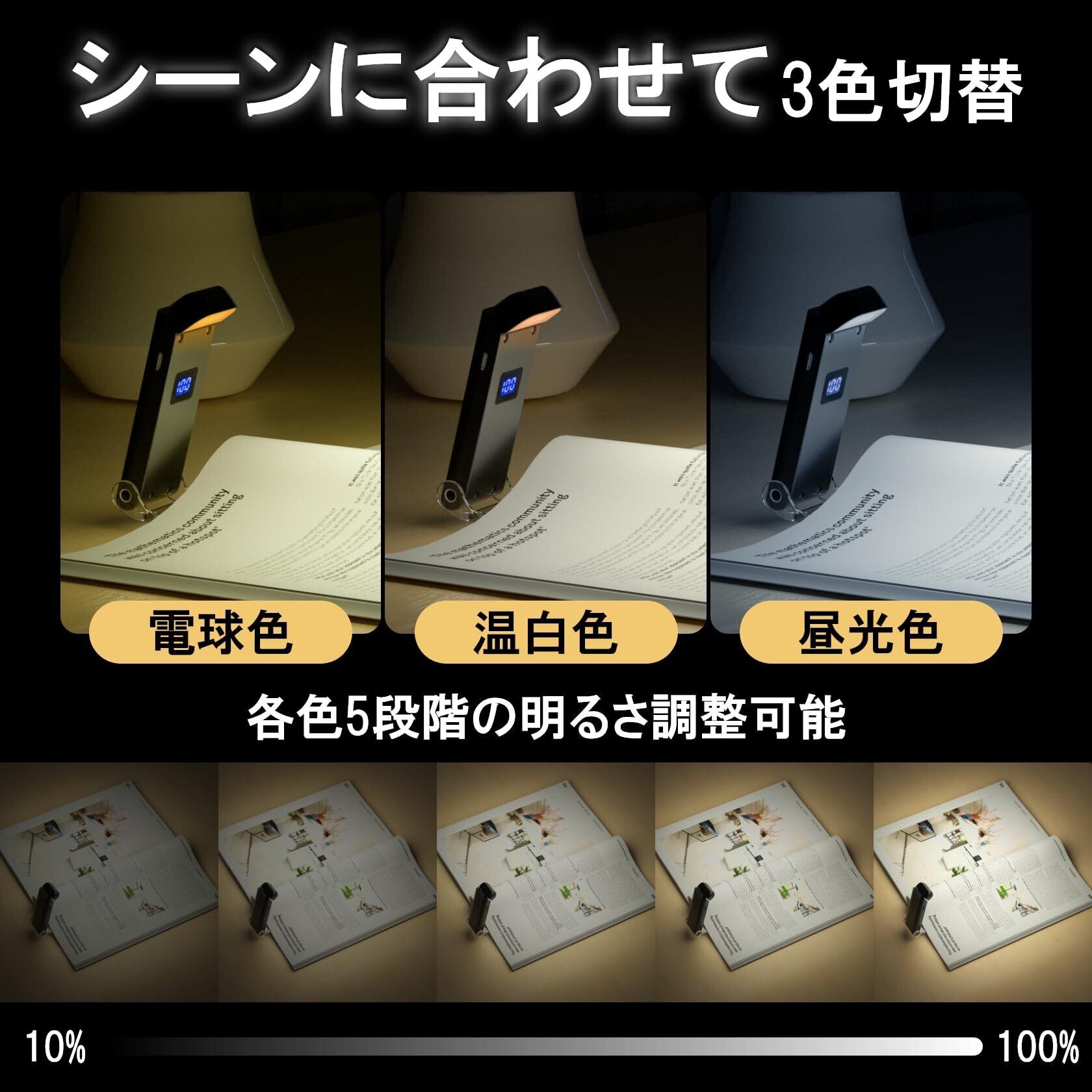 【3色切替・5段階調光】この読書ライトは、電球色・温白色・昼光色の3つの色温度から選べ、5段階の明るさ調整で最適な光を実現。シーンに応じて、明るさと色温度をお好みに合わせて設定できます。5個のLEDビーズで均一な光を提供。十分な明るさで周囲を気にせず、快適な読書体験が楽しめます。