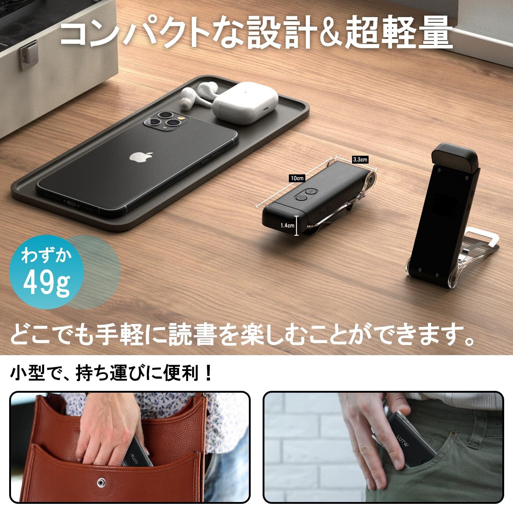 【コンパクト&超軽量】厚さ約1cmのスリムなデザインで、わずか49gの軽さ。持ち運びに便利で、どんな本にも簡単にクリップできます。軽さを感じさせない快適な使い心地で、長時間の読書でも腕が疲れません。コンパクトなサイズ感で、旅行や出張にも最適。どこでも手軽に読書を楽しむことができます。
