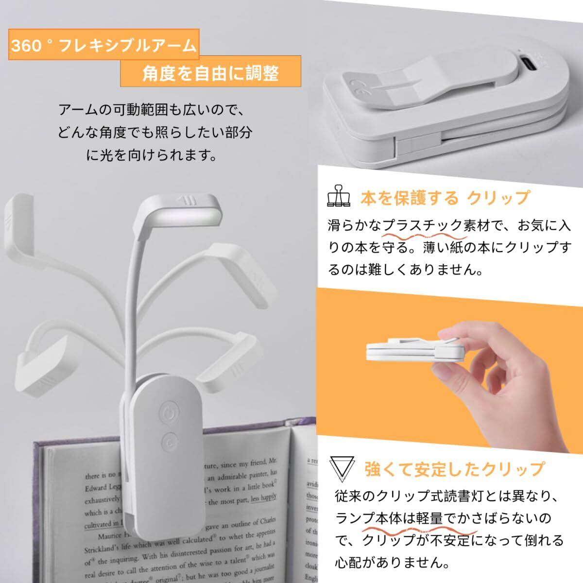 【角度自由自在|フレキシブルアーム設計】 11cmの柔軟なフレキシブルアームを採用した、本につけるライト。光の向きを自由自在に調整できるため、本の隅々まで的確に照らします。クリップ式で本に直接固定できるので、寝ながらの読書や、お子様への読み聞かせにも最適。隣で寝ている家族の邪魔をしない「自分だけの読書空間」を作り出します。従来のかさばる読書ライトとは異なり、座っても横になっても、読書に没頭できるストレスフリーな設計です。