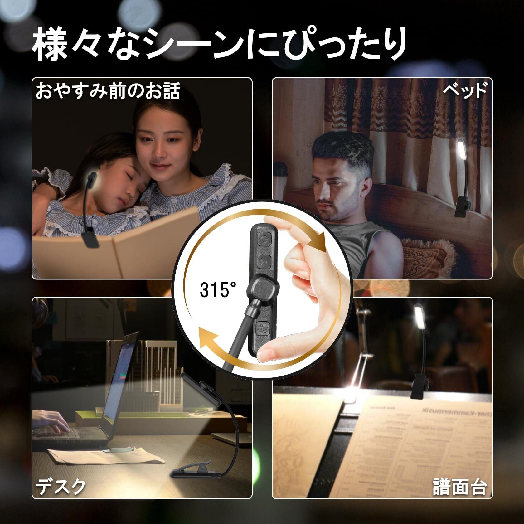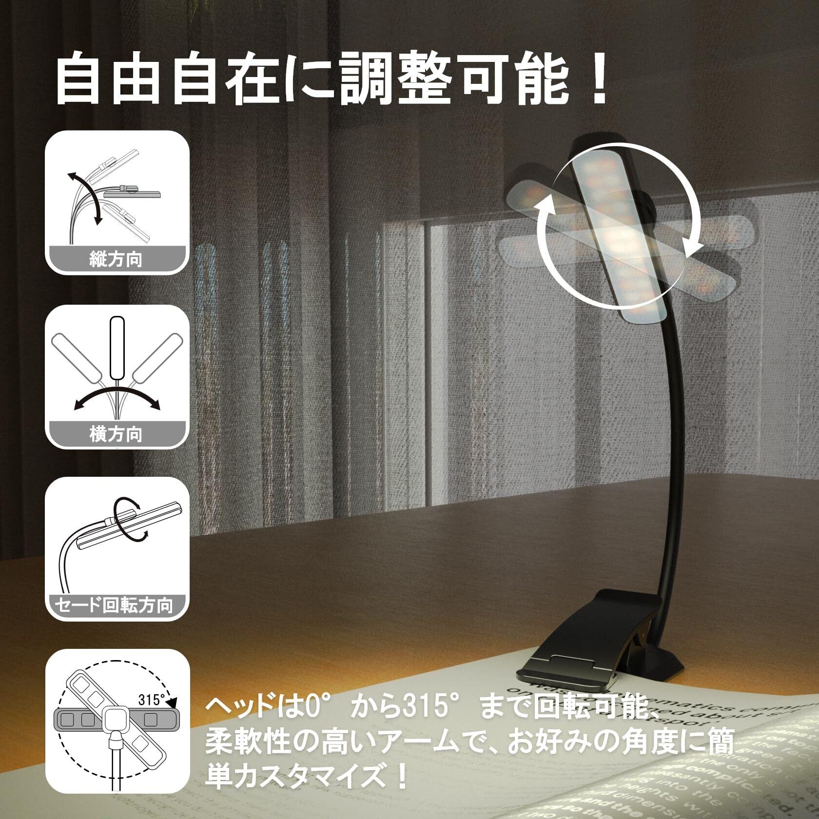読書灯 ブックライト 回転式 LED 目に優しい 24LED 3段階調色・無段階調光 5段階明るさ調節 USB充電式 1000mAh 譜面灯 フレキシブルアーム 軽量 ポータブル 手元ライト ベッド 停電 哺乳 読書 譜面台 防災用 ブラック