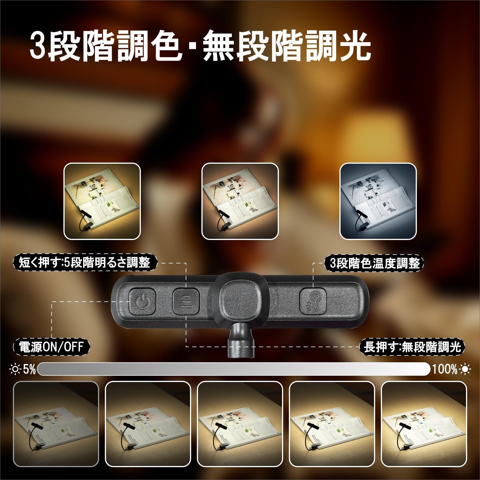【3段階調色・無段階調光】この読書ライトは、電球色・温白色・昼光色の3つの色温度に切り替え可能。短押しで5段階の明るさ調整、長押しで無段階調光が可能。お好みに合わせて自由に光を調整できます。