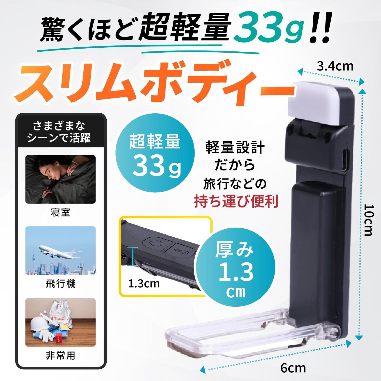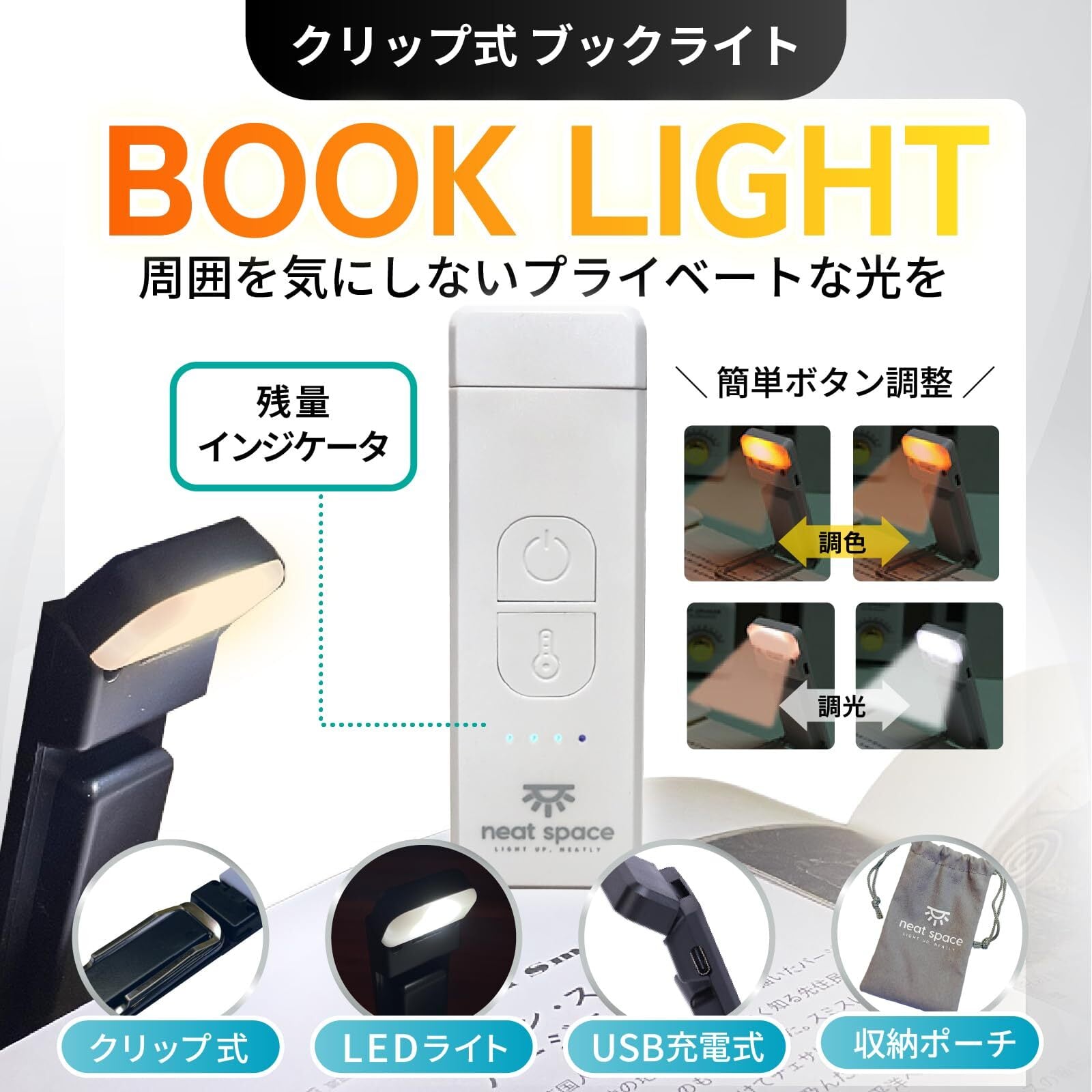 【コンパクト & 超軽量】Neat spaceブックライトは従来のブックライトとは違って、コンパクト(1.3cm)で超軽量(33g)なデザインで設計されています。小さなサイズではありますが、高い機能性とパフォーマンスであなたへ素敵な空間を提供します。