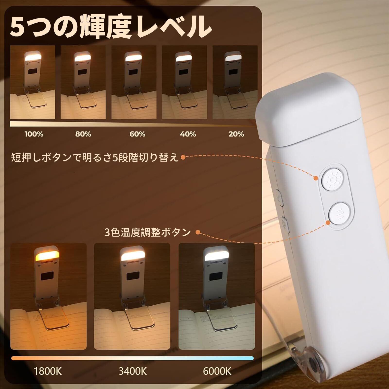 【3色切替・5段階調光】この読書ライトは、電球色・温白色・昼光色の3つの色温度から選べ、5段階の明るさ調整で最適な光を実現。シーンに応じて、明るさと色温度をお好みに合わせて設定できます。5個のLEDビーズで均一な光を提供。十分な明るさで周囲を気にせず、快適な読書体験が楽しめます。