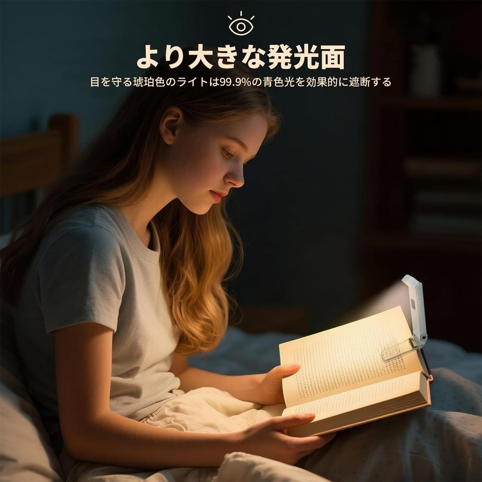 【照明角度自由調整】クリップ式デザインで、滑りにくく、本に簡単に取り付け可能。クリップは最大280°まで開き、ライトヘッドは水平方向に左右90°、下向き45°に回転できます。角度を自由に調整できるため、手元の明かりを自在にコントロールでき、読書中の目の負担を軽減します。