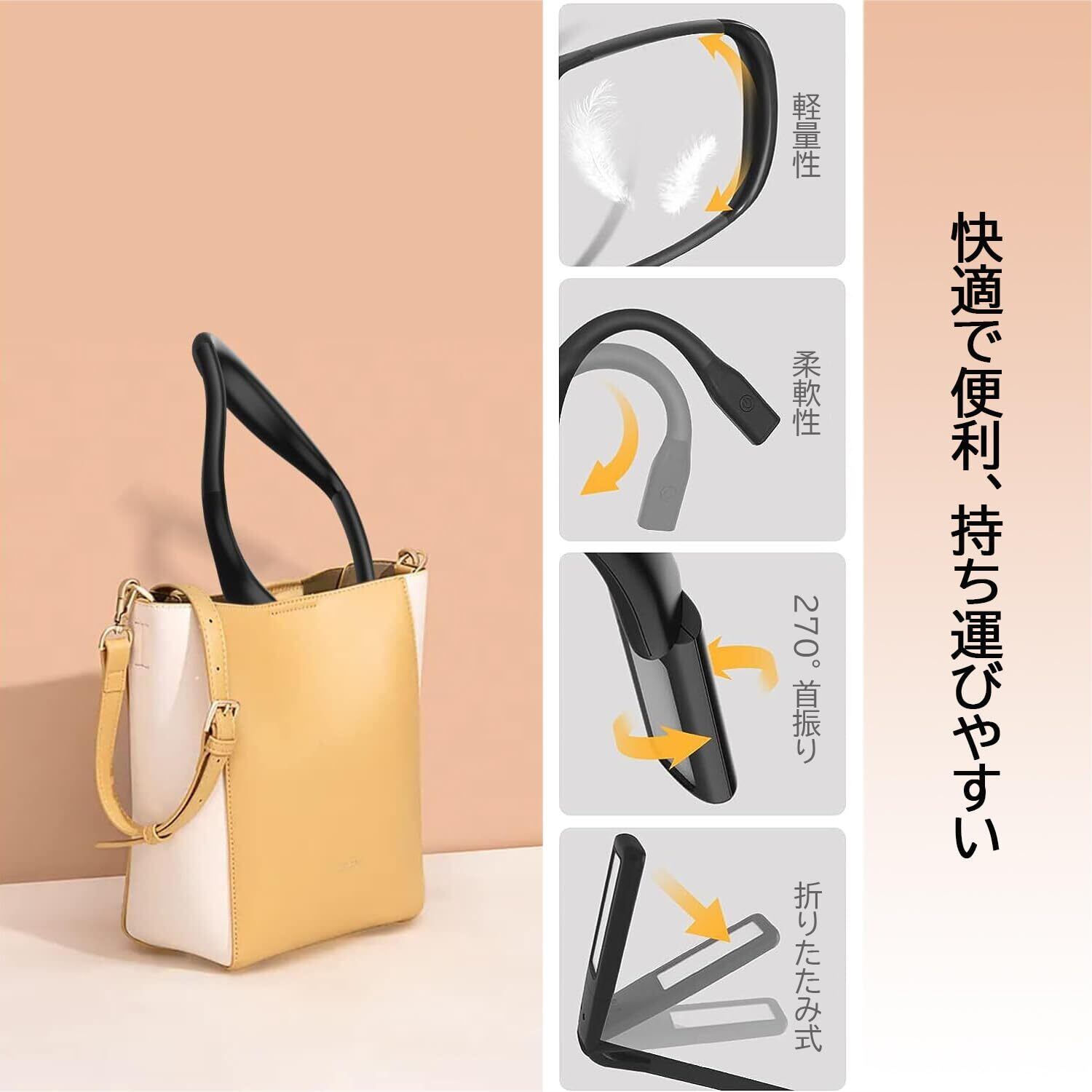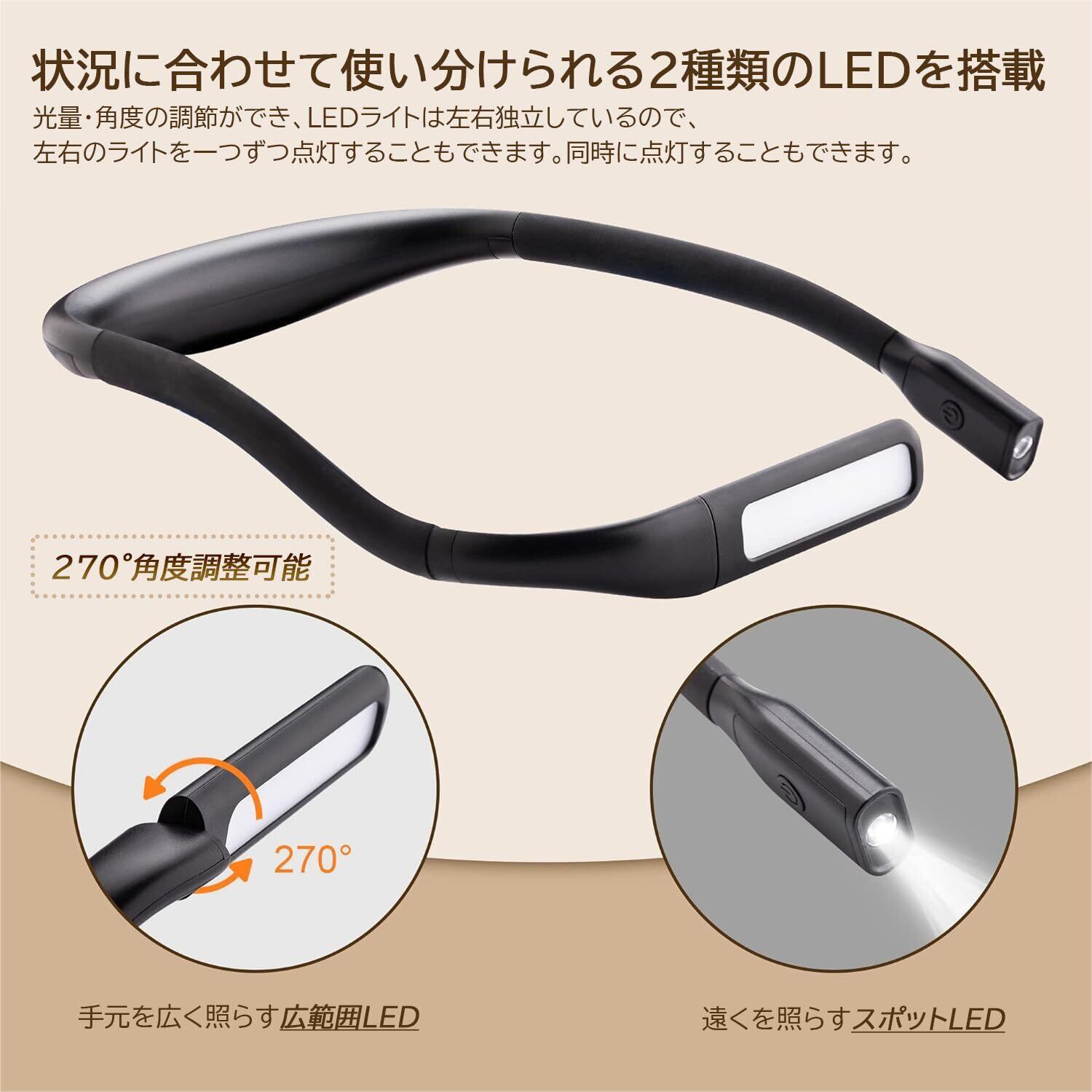 【USB充電式&人間工学デザイン】充電式のLEDネックライトは1800mAhバッテリーを付属して、フル充電すると10時間ほどを照明できます。また、フレキシブルアームで自由な向きに明かりを調整可能。使用時最も快適な角度を得ることができます。重さは165gわずかで首にかけて両手が自由に使えて、便利な首掛けライト。右側の読書灯は照明角度を270°で回転調整でき、お好みで自由に調整できます。