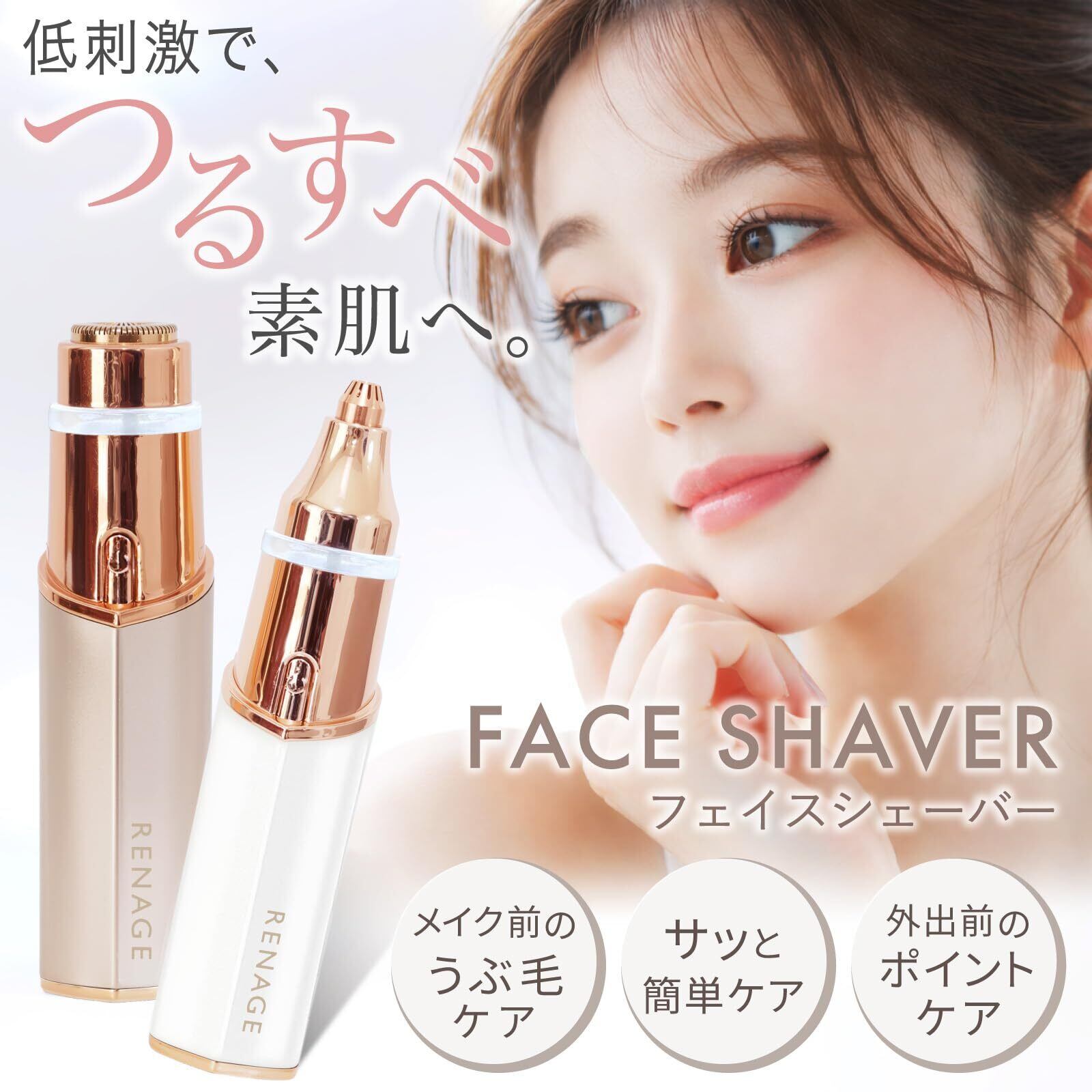 フェイスシェーバー レディース 女性 顔用 電動シェーバー 産毛 眉毛 口周り かおそり 女性用 無痛 USB充電 コンパクト 防水 RENAGE (電池式・ローズゴールド)