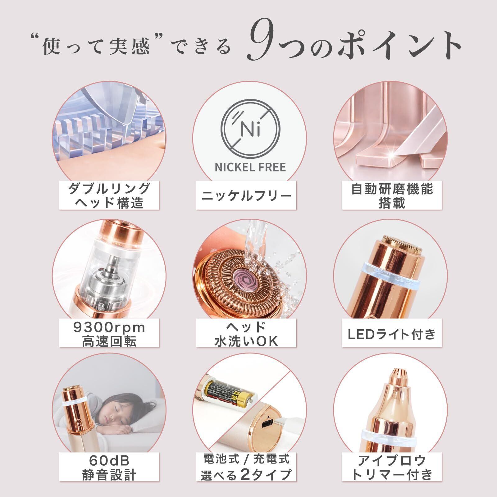 【数量限定】フェイスシェーバー レディース 女性 顔用 電動シェーバー 産毛 眉毛 口周り かおそり 女性用 無痛 USB充電 コンパクト 防水 RENAGE (電池式・ローズゴールド)