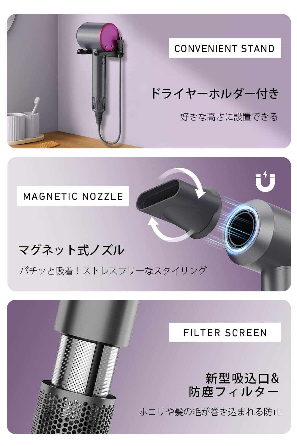【軽量設計&使いやすさ重視|収納便利&ギフトにも最適】 本体重量は約495gの軽量設計。長時間のご使用でも腕が疲れにくく、旅行や出張にも便利です。マグネット式ノズルで着脱や風向きの調整もスムーズ。吸込口には防塵フィルターを搭載し、ホコリや髪の侵入を防止します。専用ドライヤーホルダー付きで収納もすっきり。高性能とデザイン性を兼ね備えたヘアドライヤーは、誕生日や母の日、記念日などのギフトにもおすすめです。