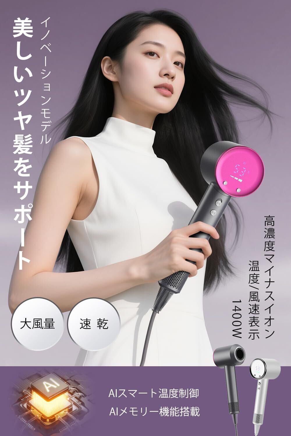 【1400W高効率モーター × 40m/s高速気流|圧倒的速乾ドライヤー】 進化型ヘアドライヤーは1400Wの高効率モーターを搭載し、最大風速40m/sのパワフルな高速気流を実現。高温に頼らず、強い風で髪の根元から水分を一気に吹き飛ばすことで、乾燥時間を大幅に短縮します。従来モデルと比較して最大約50%の速乾効果が期待でき(※使用環境・髪質により異なります)、忙しい朝でも乾燥とスタイリングを時短し、美しい仕上がりを叶える速乾ドライヤーです。熱ダメージを抑えながら、効率よく美しい仕上がりへと導きます。