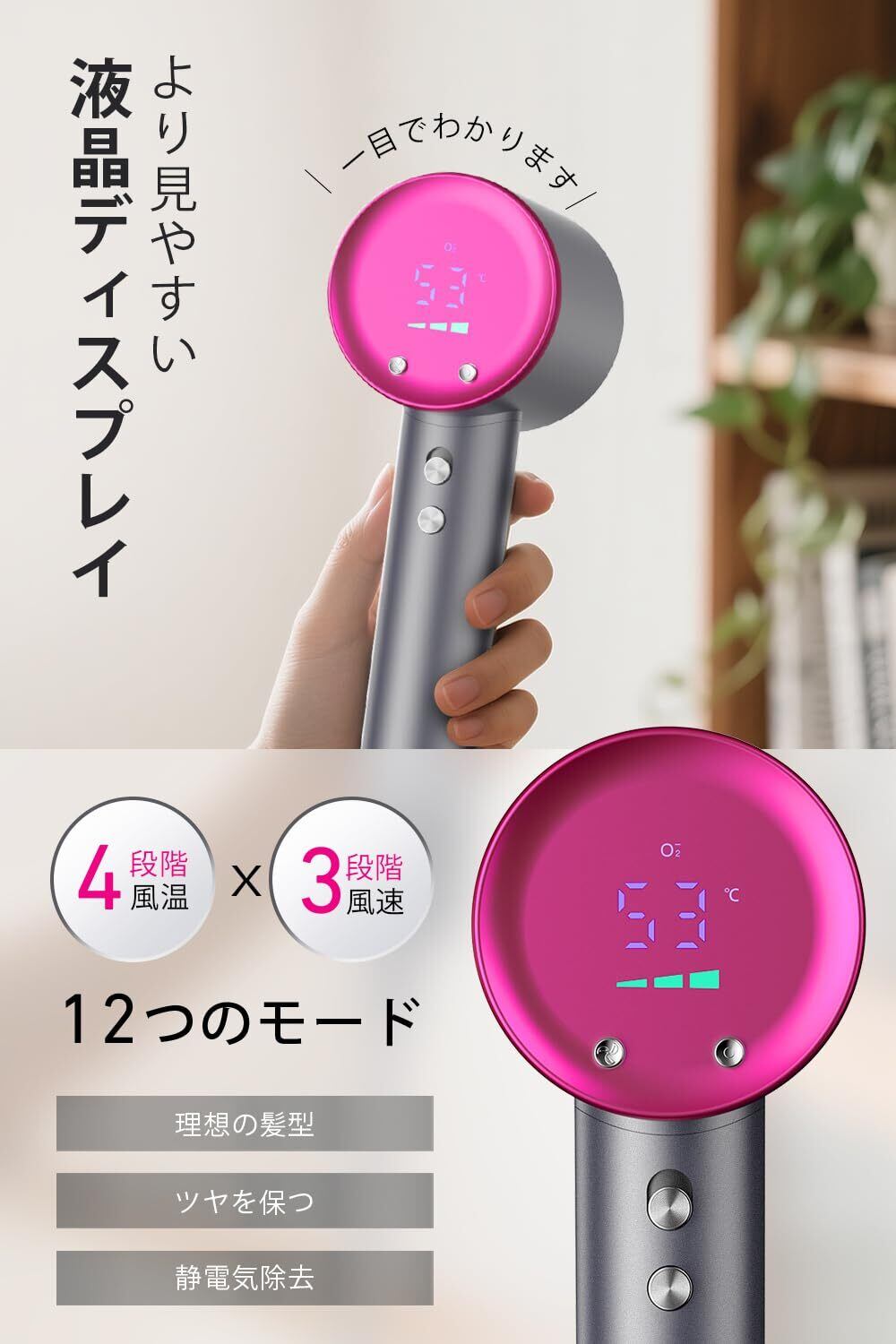 【スマートディスプレイ搭載|12モード自由調整&メモリー機能】 温度・風量・イオンの状態をリアルタイムで表示するスマートディスプレイを採用。4段階の温度と3段階の風量を組み合わせ 大風量ドライヤーは、全12モードからお好みの設定をお選びいただけます。髪質やスタイリング目的に合わせて細かく調整可能で、冷風モードは仕上げやセットに最適です。さらに、メモリー機能が前回の設定を自動的に再現するため、毎回の操作の手間を省きます。