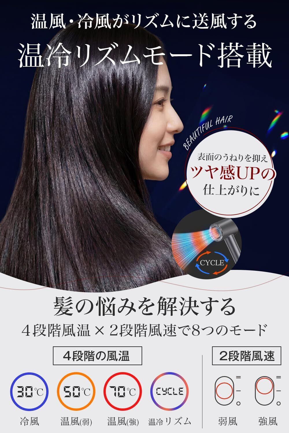 【速乾&ヘアケアを両立したヘアドライヤー】ドライヤー 大風量に加え、ヘアケア機能も備えています。ヘアケア機能① 3億個/㎤※の高濃度マイナスイオンが髪の内部まで深く浸透し、潤いを守って静電気を抑え、髪表面を滑らかに整えることで、健やかでツヤのある髪に!ヘアケア機能②温風と冷風を一定間隔で自動切換する「温冷風自動循環モード」で、髪表面温度を適温に保ちながら、キューティクルを整えて、指通りの良いシルク髪へ!髪のパサつきや癖、縮毛、まとわりの悪さなどの改善に役立ちます。髪のプロである美容師もおすすめのマイナスイオンドライヤー です!