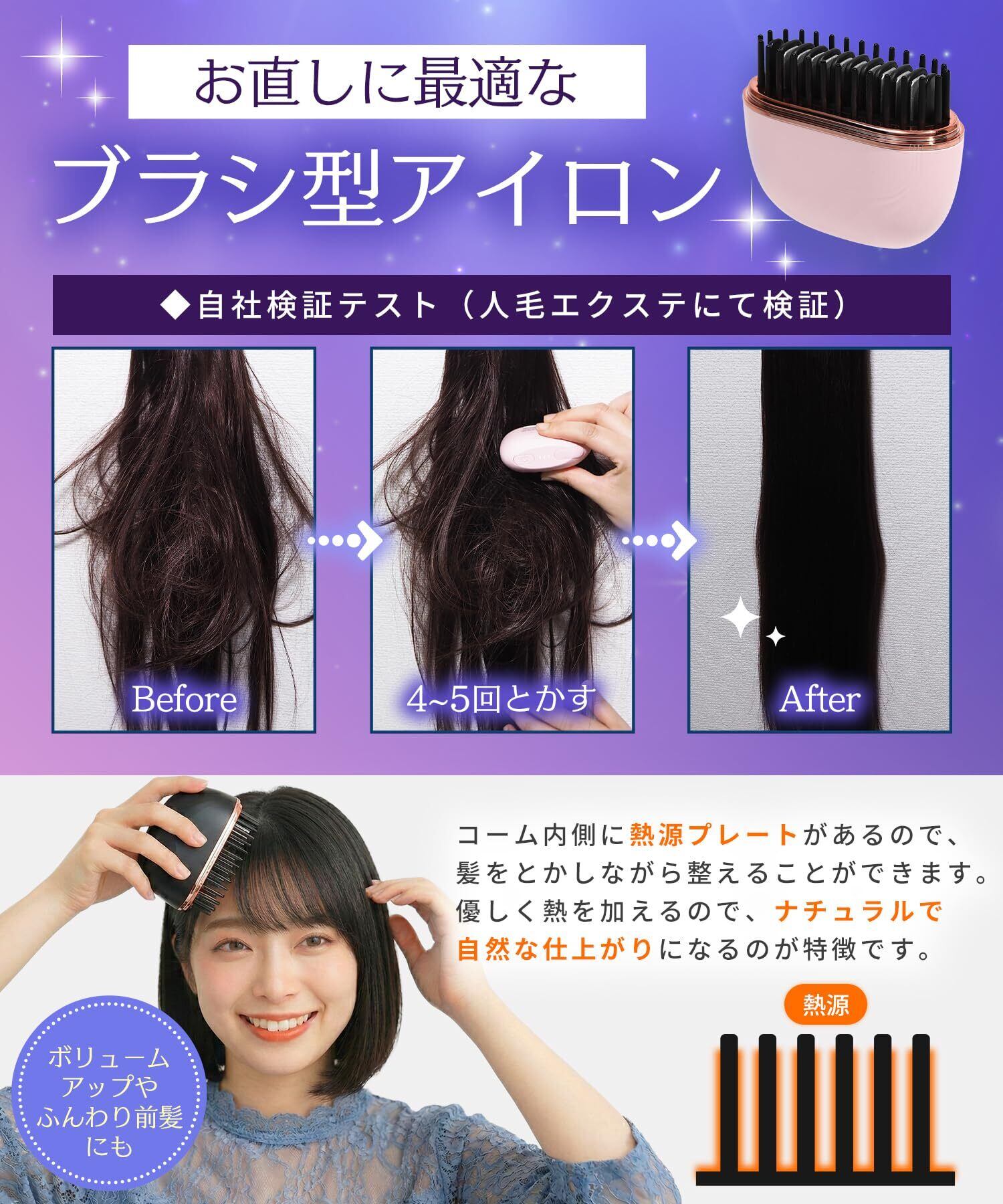 【髪へのダメージが少ないブラシタイプ】髪を挟まないヒートブラシ タイプのヘアアイロンなので、熱によるダメージを抑えつつ、髪をとかしながら、サッとスタイリングできます。