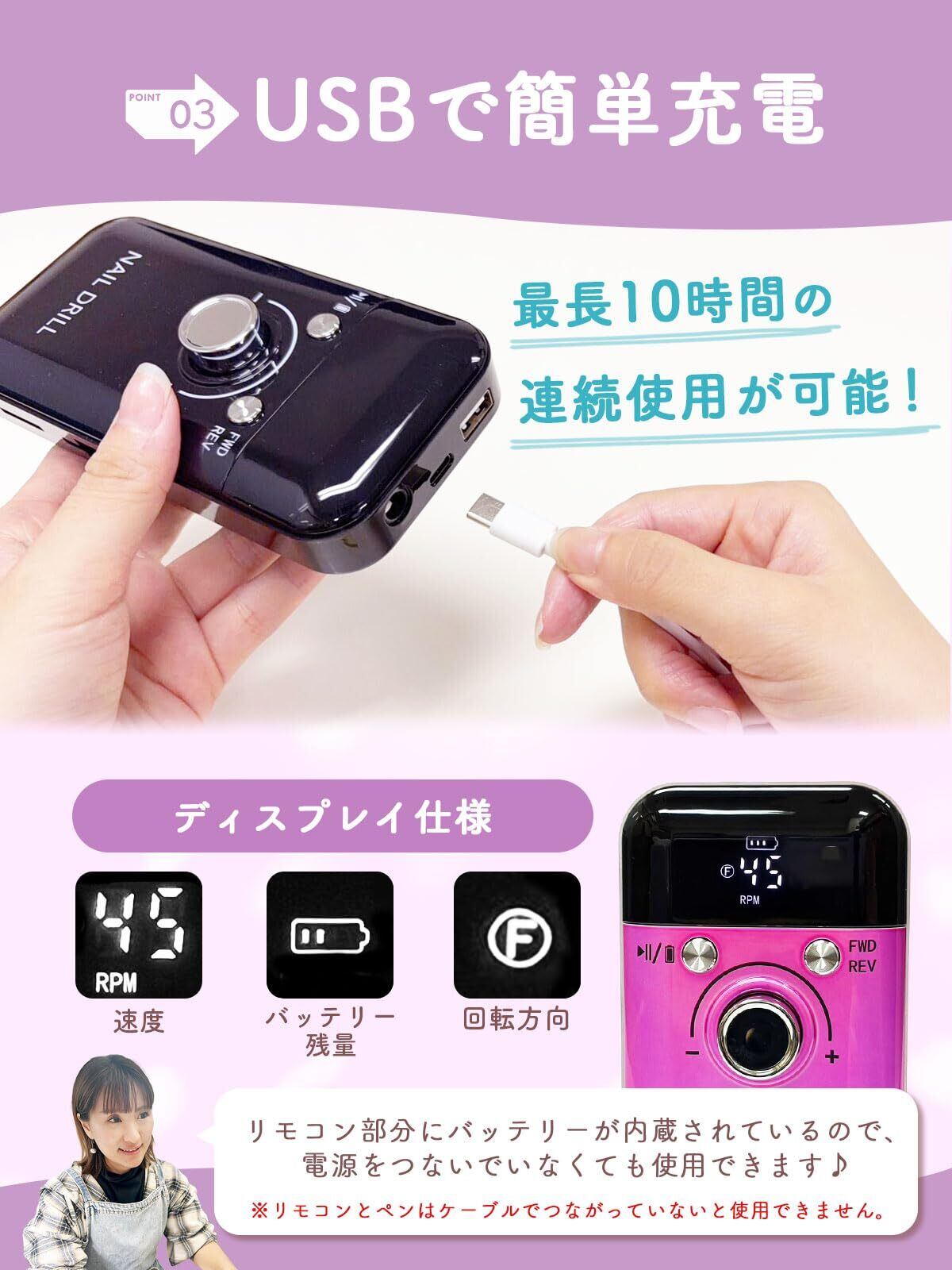 ネイルマシン おうちでサロン仕上げx最大45,000回転xUSB充電式x6種のビット付き (ブラック)