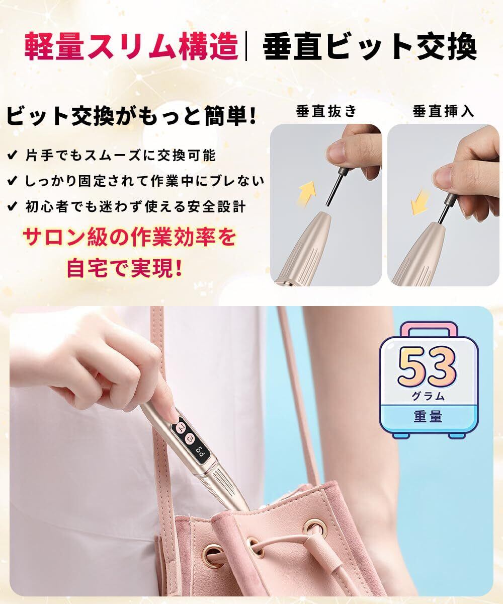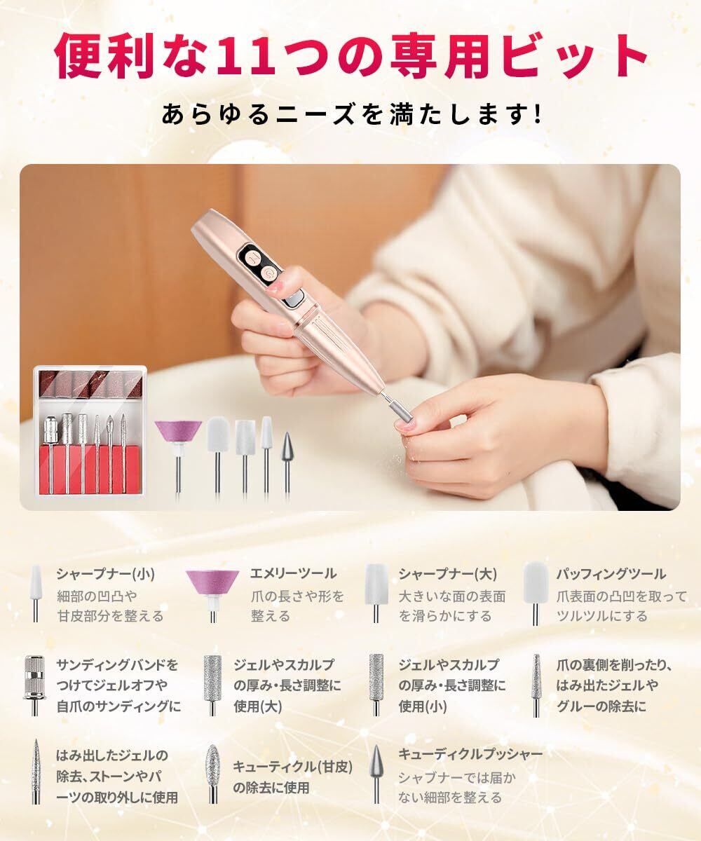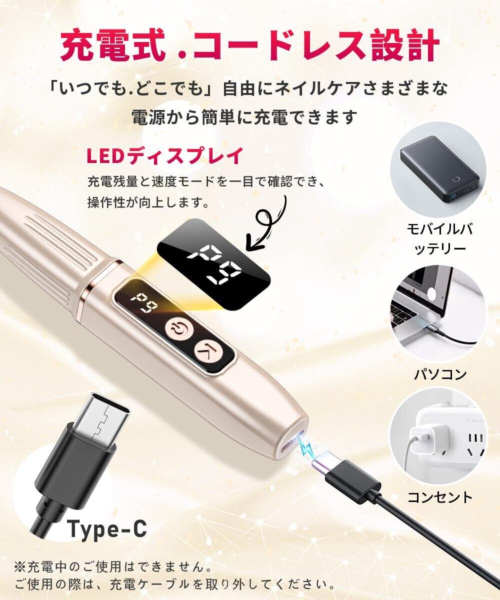 ネイルマシン ネイルマシン 1台で多用途 20000RPM 高速回転 9档モード搭載 USB充電式 携帯便利 LEDディスプレイ 低騒音 正逆回転 甘皮処理・リムーバー・爪磨き対応 多機能 ネイルポリッシャー (シャンパンゴールド)