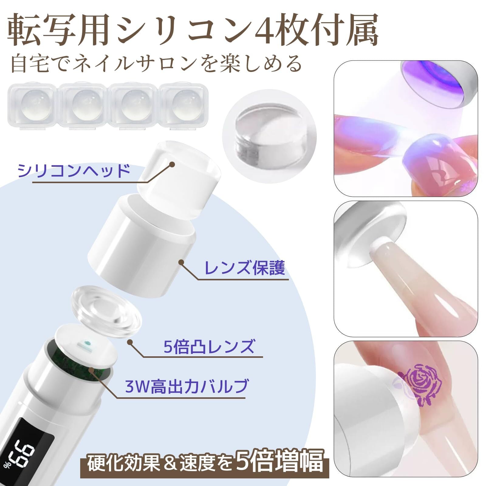 【シリコンヘッド付き】ネイルライトのレンズに高硬度透明保護カバーを使用し、4つのシリコンヘッドがも付属します。組み合わせて使用すると、凹凸パーツの仮硬化、フレンチデザイン、プレートの転写などのデザインも手軽く仕上げます。自宅でオリジナルのDIYネイルを楽しめます。