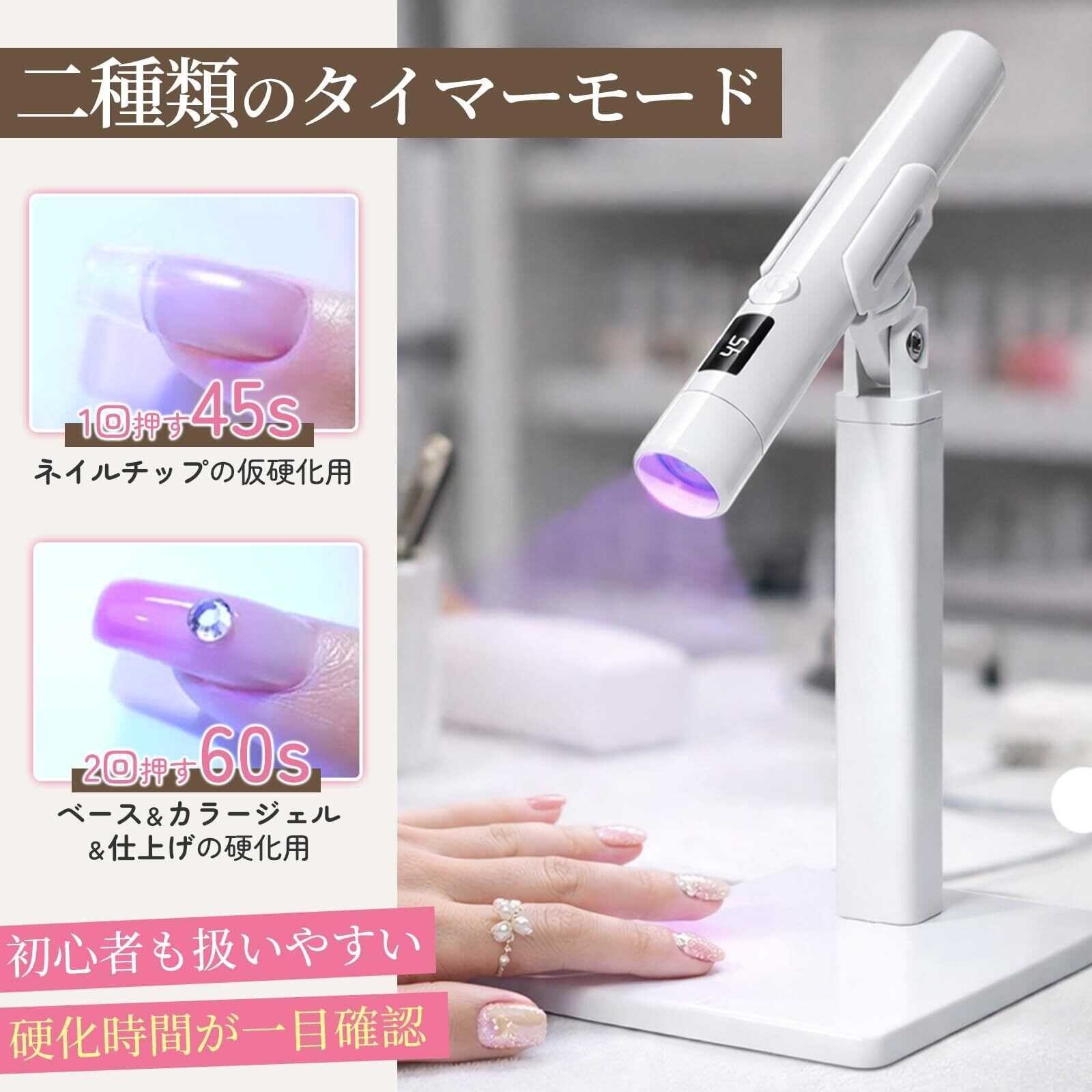 【2WAYミニネイルライト】2026最新型ミニネイルライトはマグネットスタンドが付属し、360度回転可能なスタンドは照射角度を自由に変えてしっかり照射でき、細かい作業にも向いています。片手で持って手持ちネイルライトとして使用するのはもちろん、付属スタンドに掛けて使用するのも可能です。長時間使用しても手や腕が疲れにくく、自宅でネイルサロンを楽しめます。