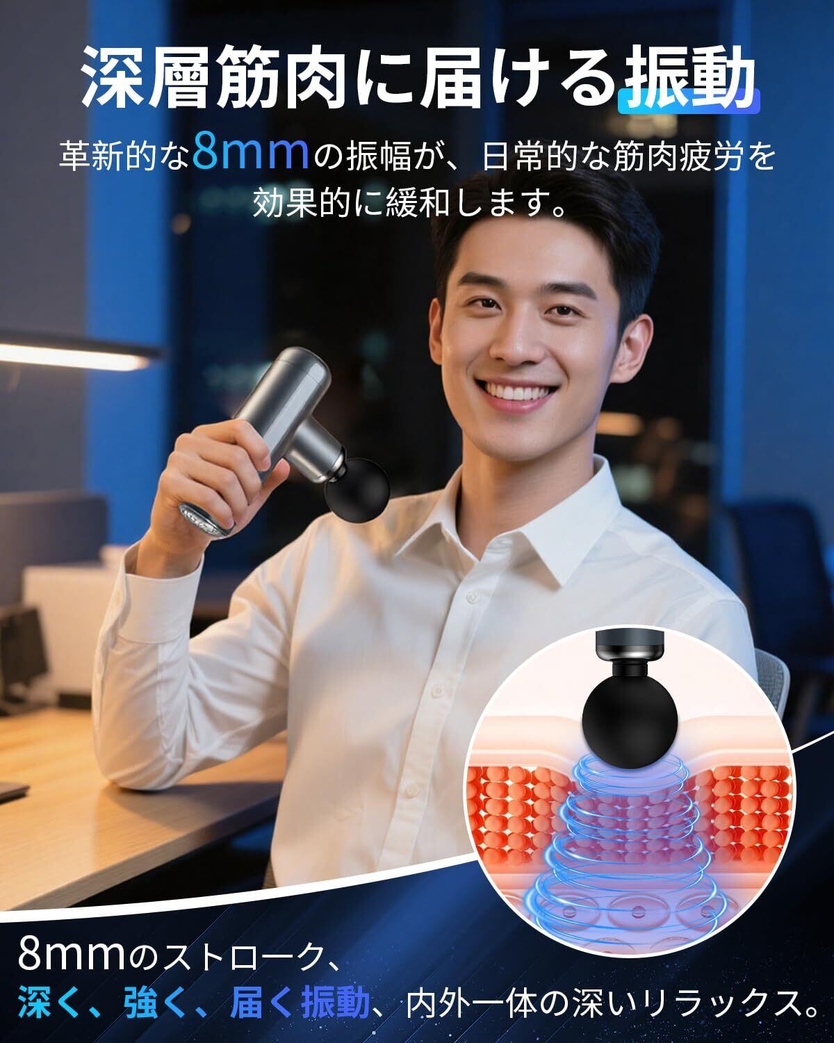 【数量限定】筋膜リリースガン ハンディガン 5段階強力振動 AI自適応モード付き 筋膜リリース 8mm深層振幅 5種類のアタッチメント Type-C急速充電 大容量バッテリー搭載 12時間連続使用 10分タイマ自動停止 静音設計 320g超軽量 小型 携帯便利 携帯ケース&日本語取扱説明書付き 誕生日 父の日 母の日 敬老の日 ギフト最適