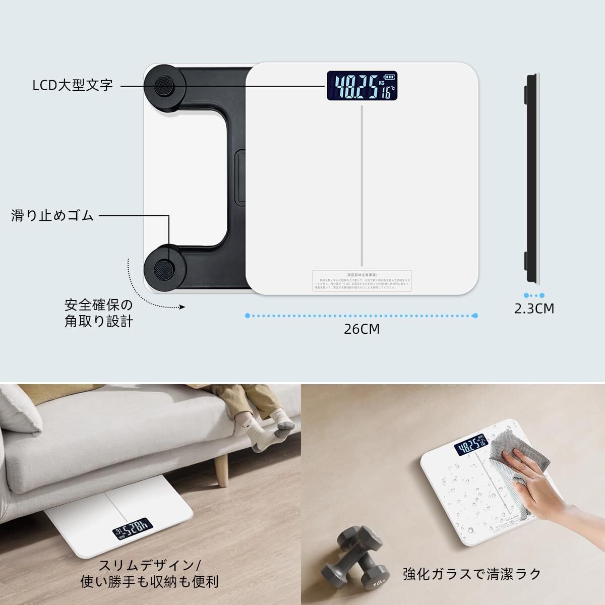 【新登場 - 高精度体重計】4つの高感度センサーとインテリジェントなキャリブレーションアルゴリズムを搭載し、0.05kgの高精度測定を実現。わずかな変化も見逃しません。ご注意:タイルやフローリングなどの硬く平らな床面でご使用ください。カーペットやマットなどの柔らかい床面は測定精度に影響を与える可能性がありますので、使用はお控えください。
