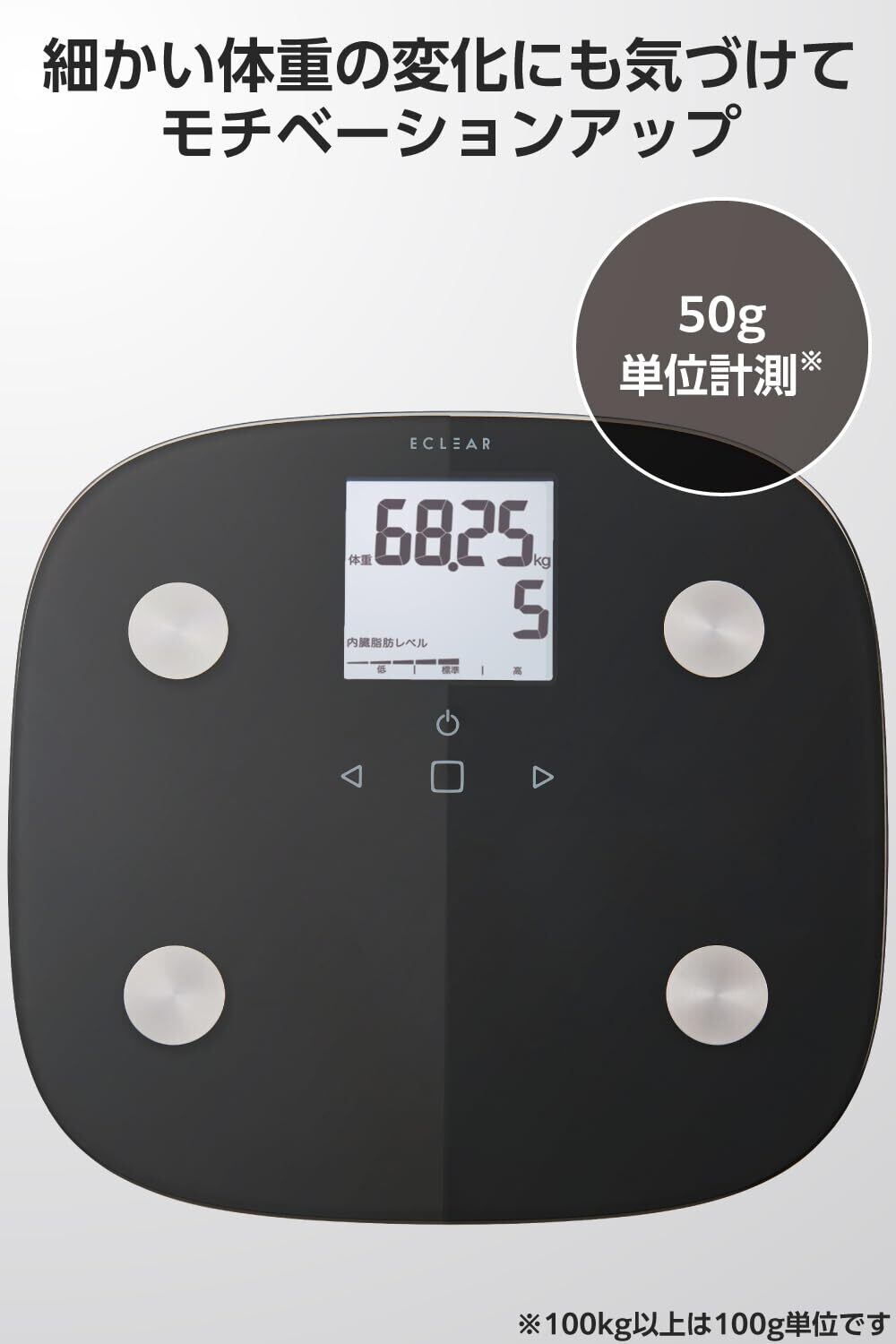 ■体重計精度:2.5kg以上~75kg以下:±100g、75kg超え~100kg以下:±150g、100kg超え~150kg以下:±300g