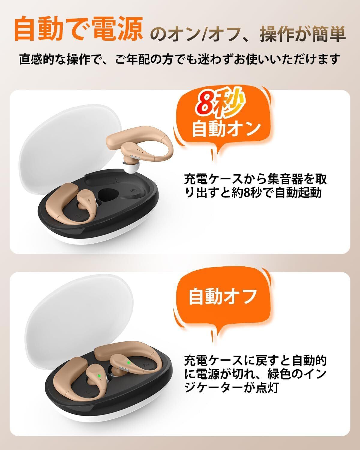 【自働的に電源ON/OFF&操作簡単】面倒な電源操作や設定調整は一切不要!充電ケースから集音器を取り出すだけで8秒で自動起動(音声ガイド付き)、使用後は充電ケースに収納するだけで自動で電源オフ&充電開始!集音器の充電中は本体が緑色のインジケーターが点灯し、充電完了とともに消灯するので、状態がひと目でわかります。