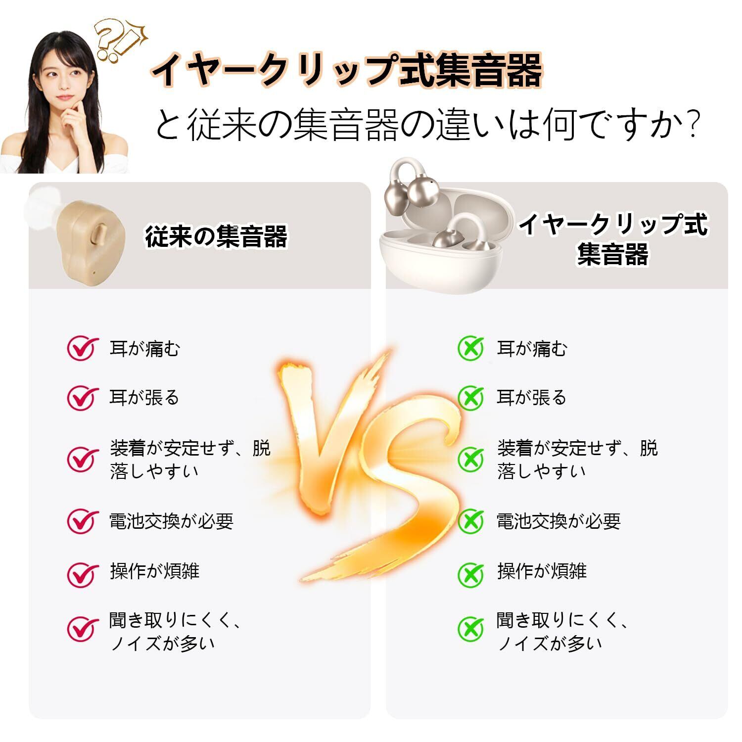 1.Cooclear新登場!耳をふさがない空気伝導技術。 2.誰にでもフィットするイヤーカフ型 & 落ちにくい。 3.操作簡単!ケースから出すだけで自動ON。 4.左右独立5段階音量調節 & 単耳使用もOK。 5.最大15時間連続使用 & 充実のセット内容。 6.耳にぴったりフィットしてくれるので眼鏡やマスクの邪魔にもなりません。 7.充電式ケースもセットされているのでお出かけ時などの持ち運びに便利です。
