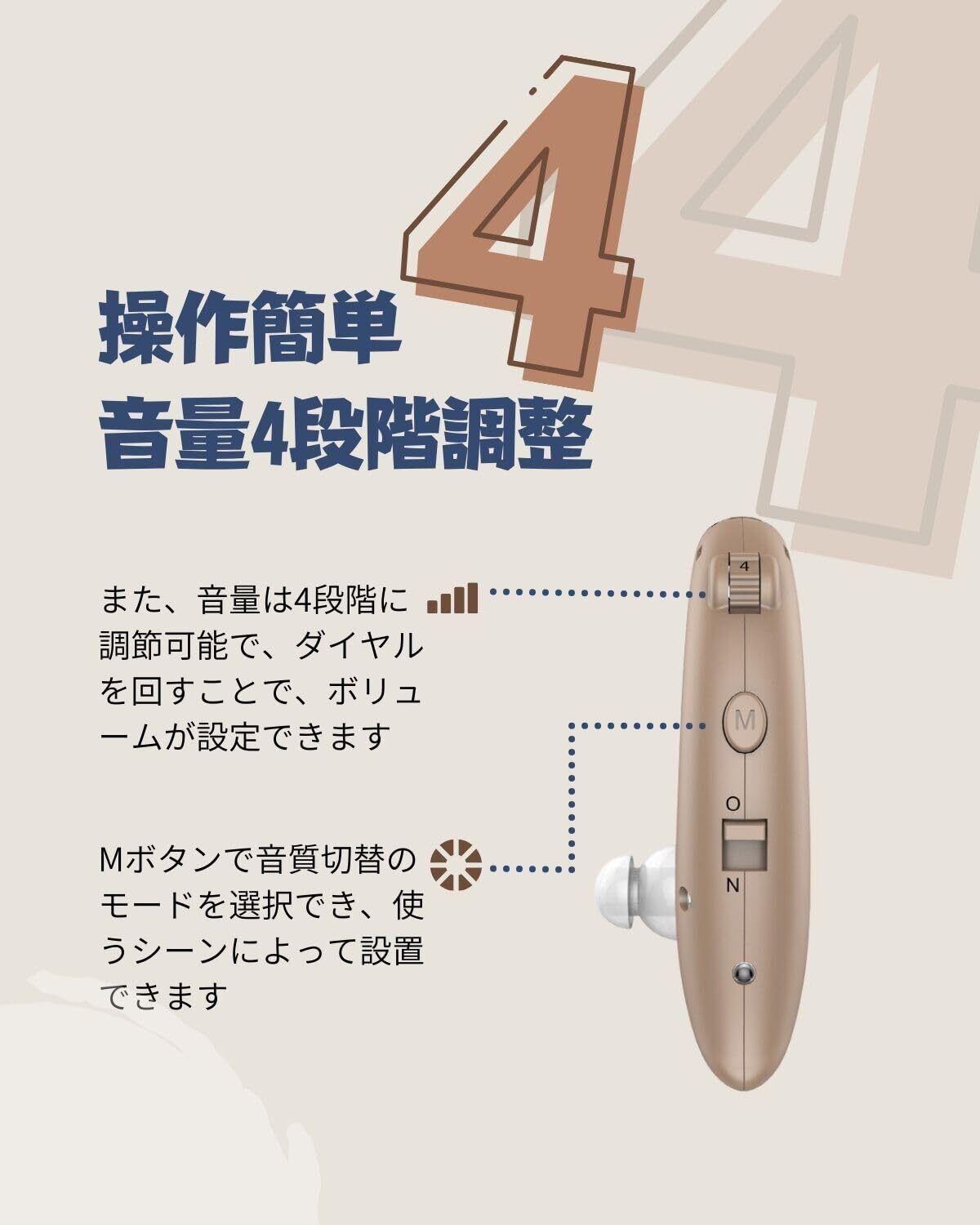 【操作簡単・音量4段階調整】イヤーピース4個付き、耳穴のサイズに合わせて適切なピースを装着してから簡 単に使用できます。また、音量は4段階に調節可能で、ダイヤルを回すことで、ボリュームが設定できます。Mボ タンで音質切替のモードを選択でき、使うシーンによって設置できます