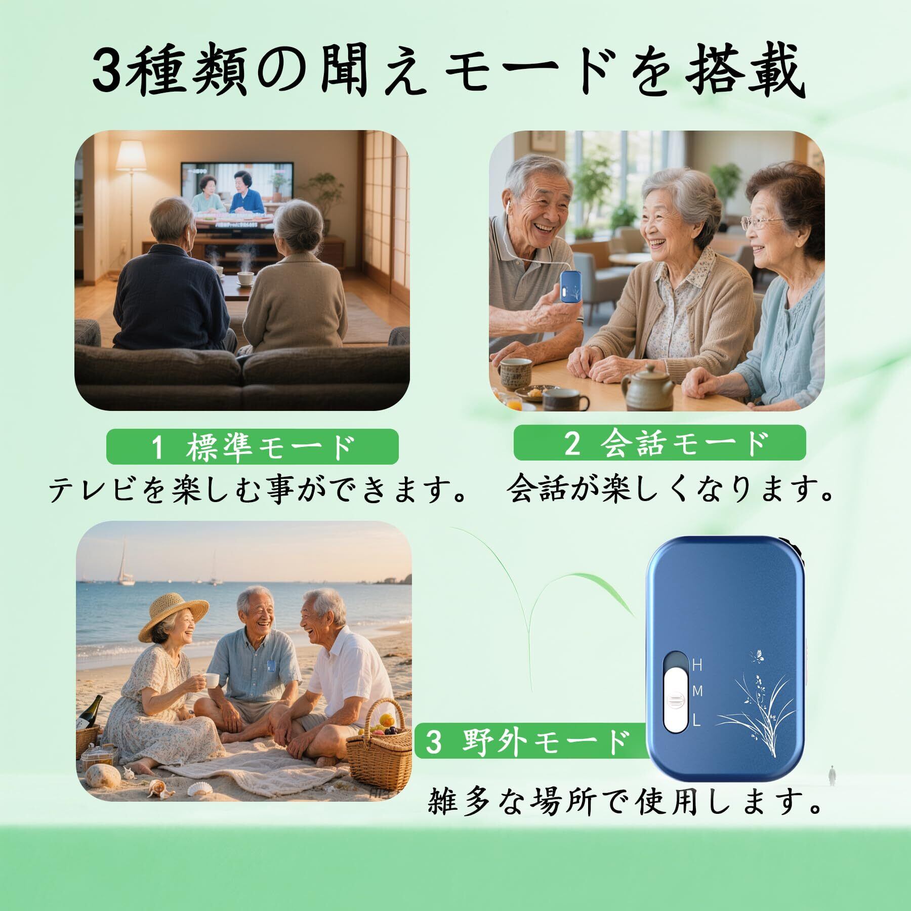 【3種類の聞えモードを搭載】:モードボタンを押すたびに、音質の周波数を変更して周辺環境に合わせた3つの音質を選ぶ事ができます。1:標準モード、2:会話モード、3:野外モード