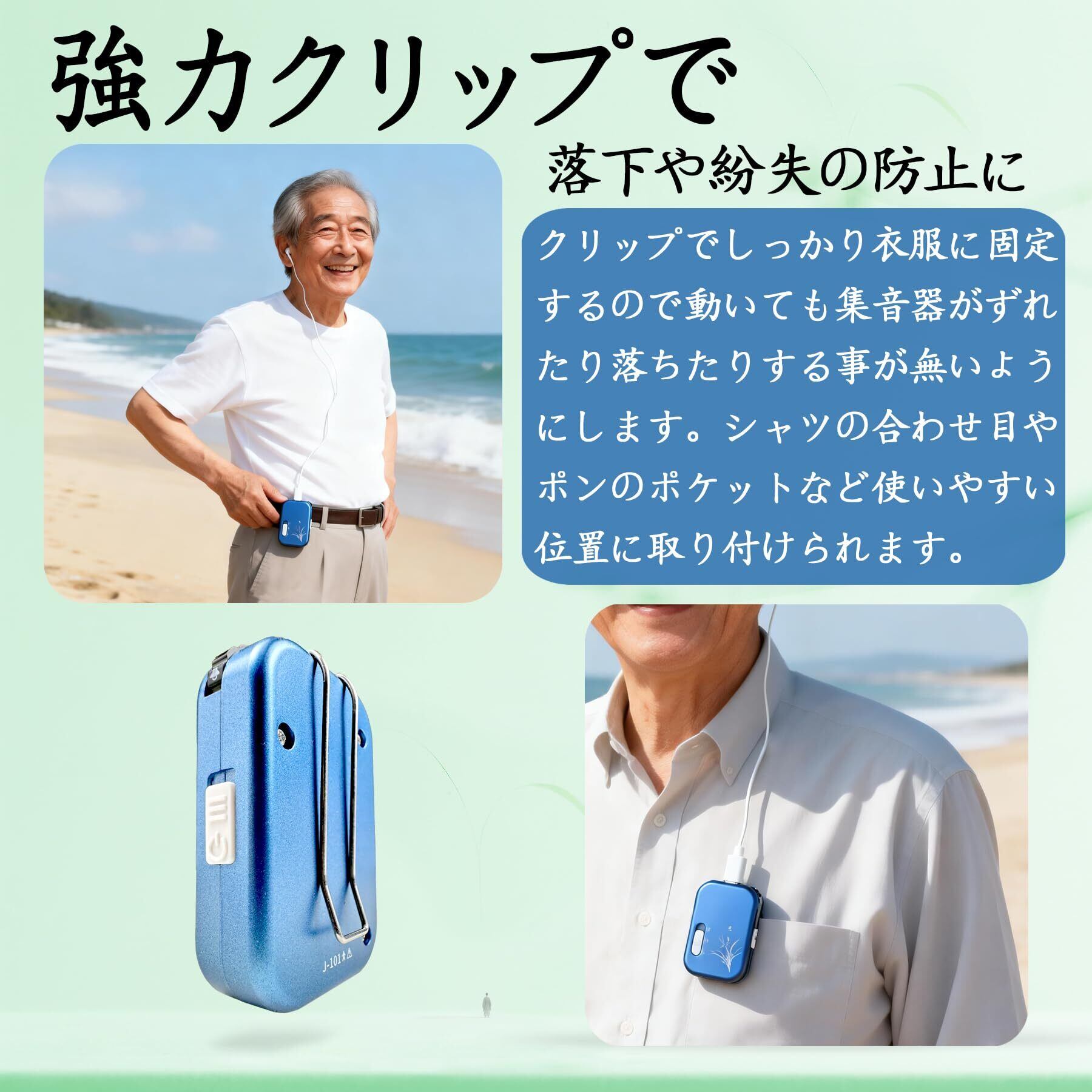 【強力クリップ】:強いバネクリップで衣服に固定するので、動いても集音器がずれたり落ちたりする事を防ぎます。シャツの合わせ目やズボンのポケットなど使いやすい位置に取り付けられます。