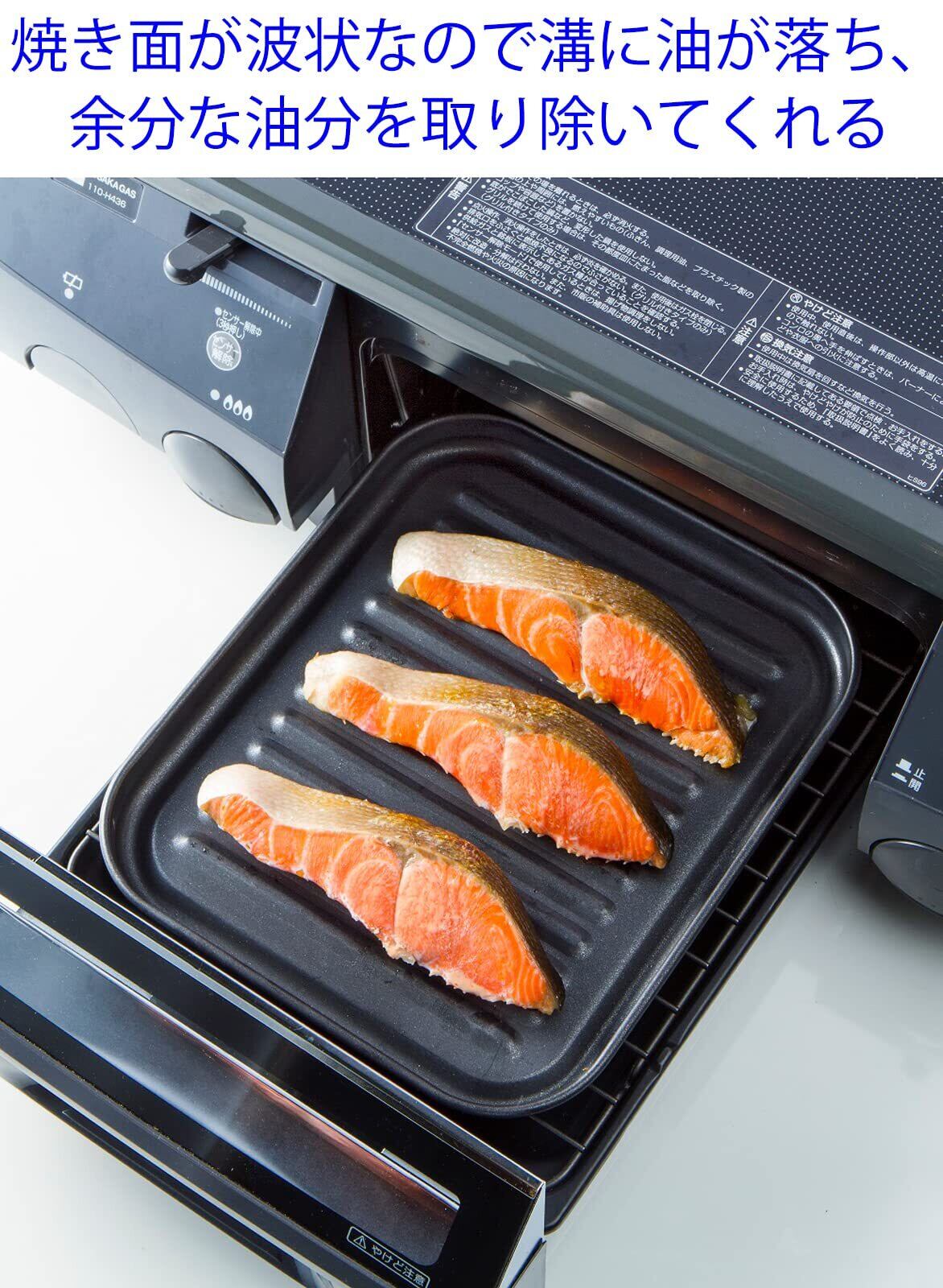 大型の角型トレー。魚焼きグリル・オーブントースターの両方で使え、食材から出る余分な油が溝に落ちてべたつかずヘルシー調理。