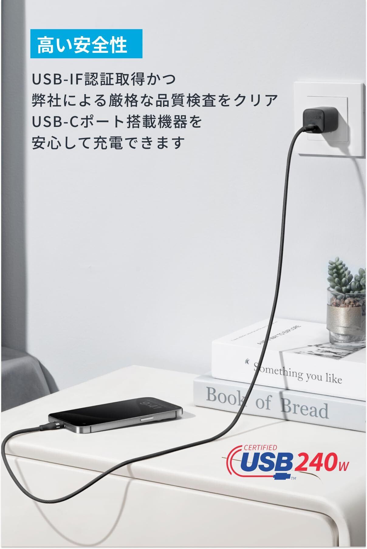高い安全性:USB-IF認証に加え、による厳格な品質検査を実施しており、お使いのUSB-C端子機器を安全にかつ急速充電していただけます。