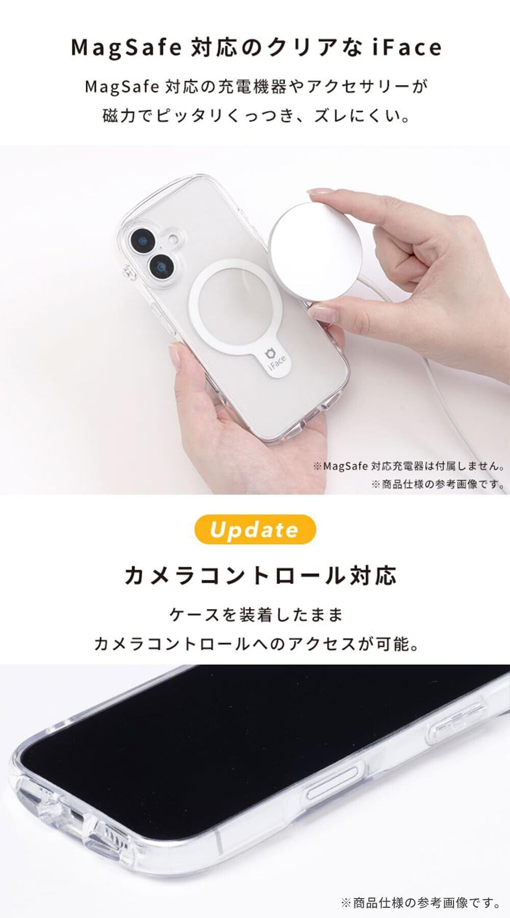 クリアな背面に、シールや写真を入れてカスタマイズが可能 / 手にしっかりフィットする「くびれ」形状で持ちやすさ抜群 / 側面部分は弾力のあるTPU、背面部分は硬いPC素材を採用 / 画面とカメラを守る、フチ高設計 / 側面のドット加工で密着痕を防止 / サイドホールもしっかり対応。カメラコントロールへのアクセスもスムーズに。 / MagSafe充電/各種MagSafeアクセサリー対応 / 選べる2カ所のストラップホール / シグネチャーボール搭載でストラップの付け方が広がる / iFaceストラップホルダー専用設計でショルダーストラップの使いやすさアップ ※ストラップホルダーを併用する場合は、iFaceから発売している製品をご使用ください。類似品ではiFaceケースと併用の使用感をしかねるため、ご注意ください。