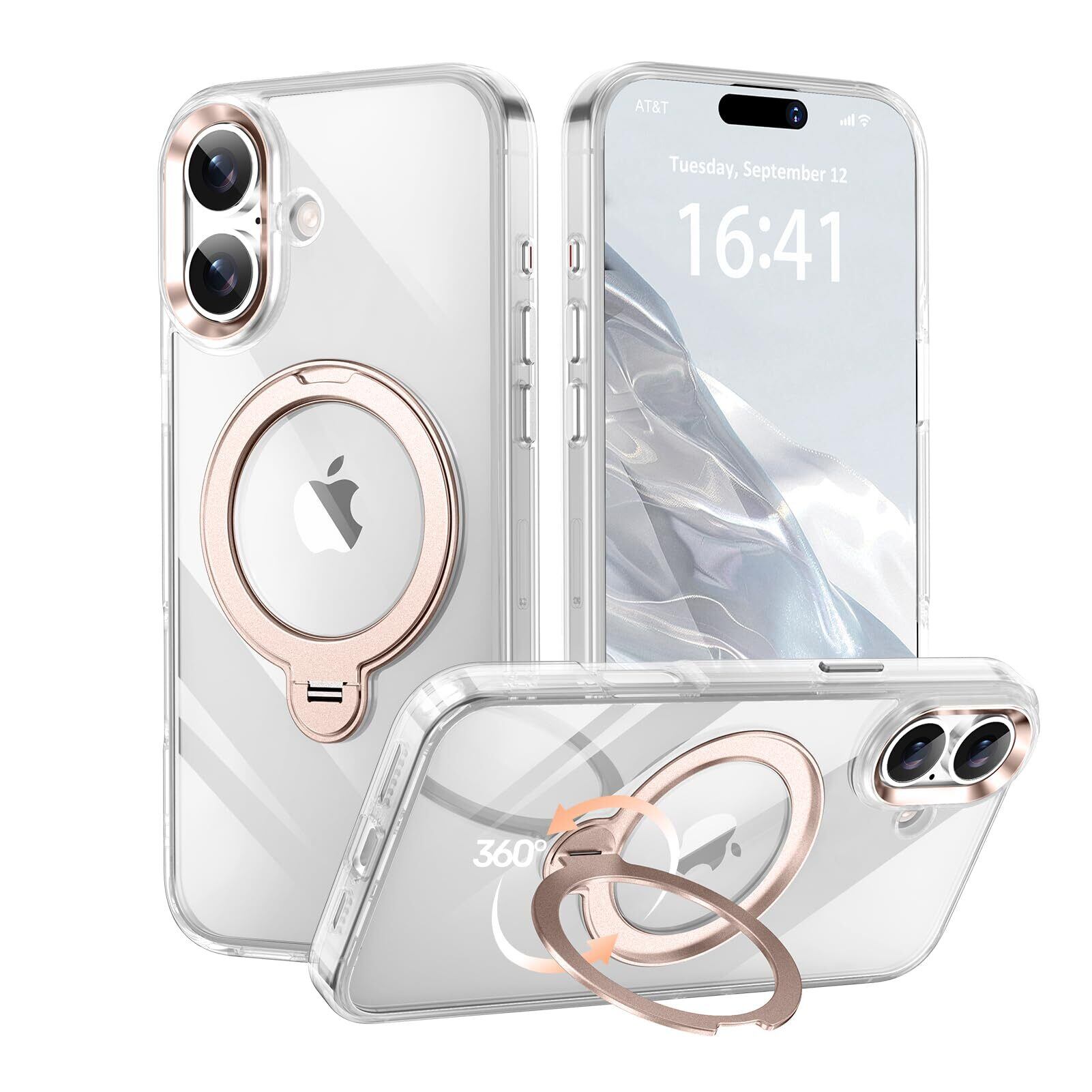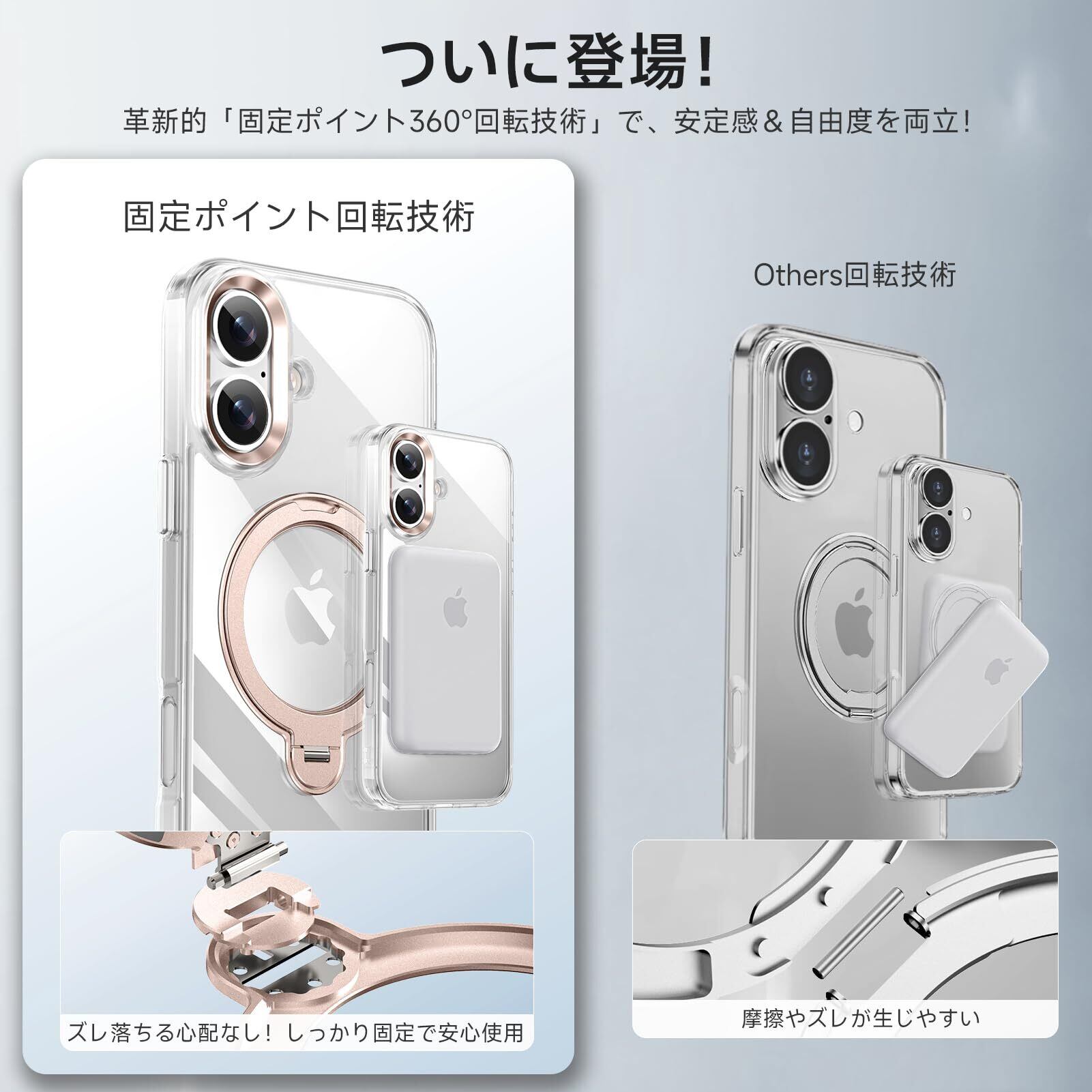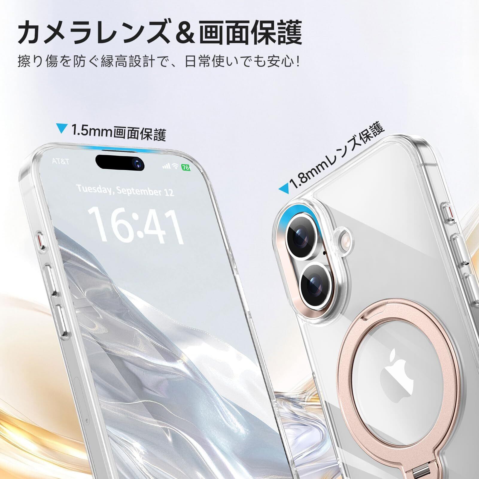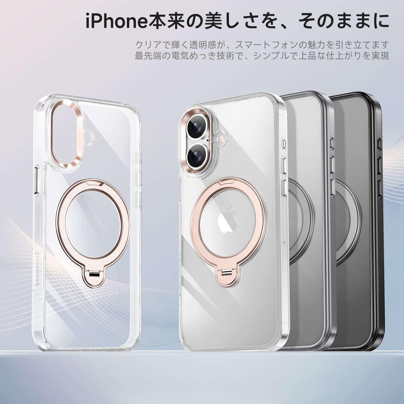 KMAMBNG iPhone 16 用 ケース Magsafe対応縦横両立 角度自在 調整可能 磁吸機能でワイヤレス充電対応 おしゃれ スマホケース(クリア&ローズゴールド, iPhone 16)