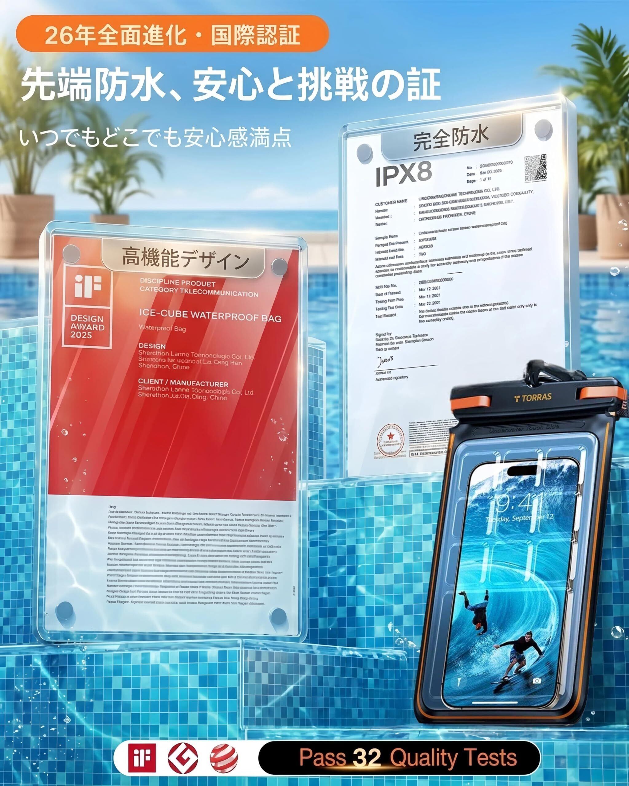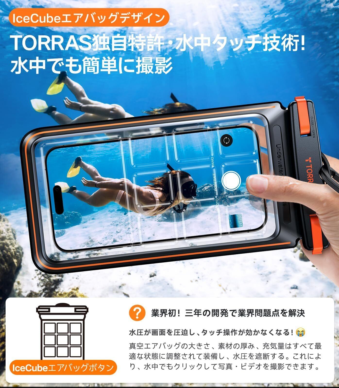 【防水ケース性能第 1 位!TORRAS だけがこの基準を達成】2025 年全面アップグレード!最高水準を達成!①最新シールドテクノロジーで良品率 97% ②95A TPU 素材で耐摩耗・高透明 ③精密 ABS ロックヘッドで水漏れゼロ!夏のプールでは子供との水遊びを記録し、浴室では泡だらけの手でもスムーズに操作。365 日品質付きで、安心して海や温泉に持ち込もう!