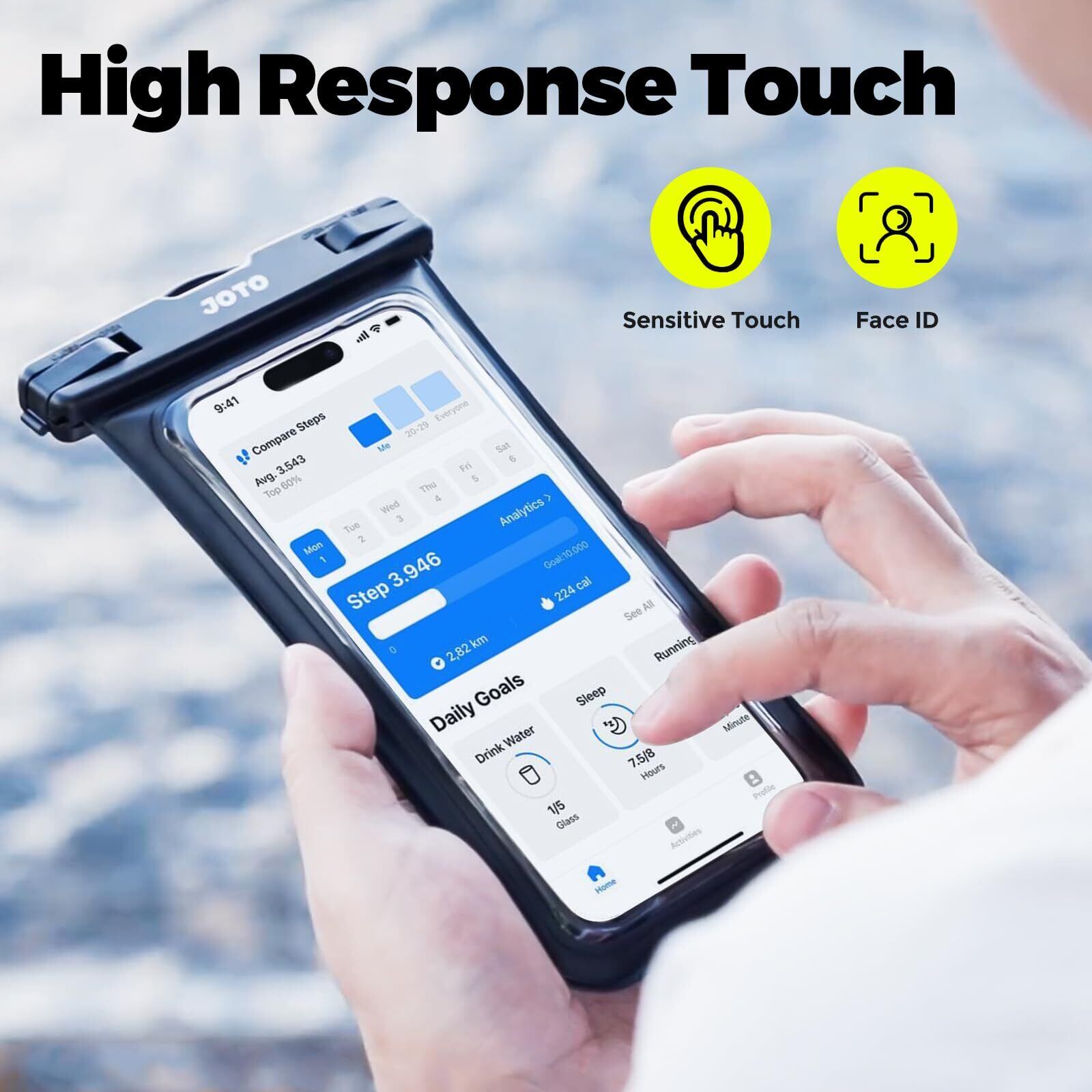 材質: 高透明度のビニール素材を採用しており、水中でも鮮明な写真や動画の撮影が可能です。高感度の防水膜によって、タッチ操作の感度を妨げることなくスムーズな操作を実現します