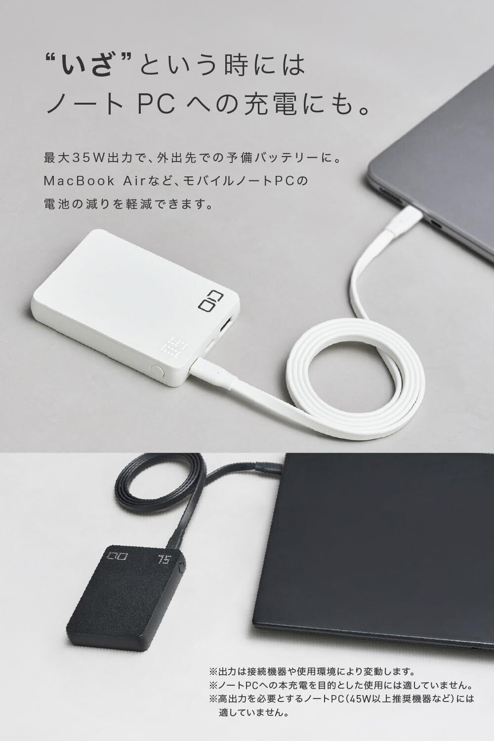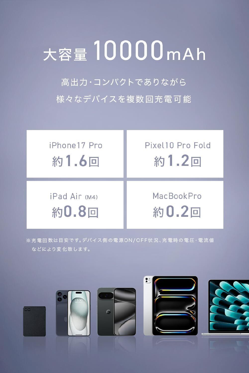 【薄さ16mm】30W以上のモバイルバッテリーの中で極限まで薄く設計された約16mmを実現。*自社調べ:10000mAh・入力30W以上のバッテリーと比較。軽量で、バッグやポーチ、通勤用のカバンにも収まりやすい薄型設計です。カフェや新幹線、飛行機、出張や旅行など、外出先での充電用として持ち歩きやすいサイズ感に仕上げています。