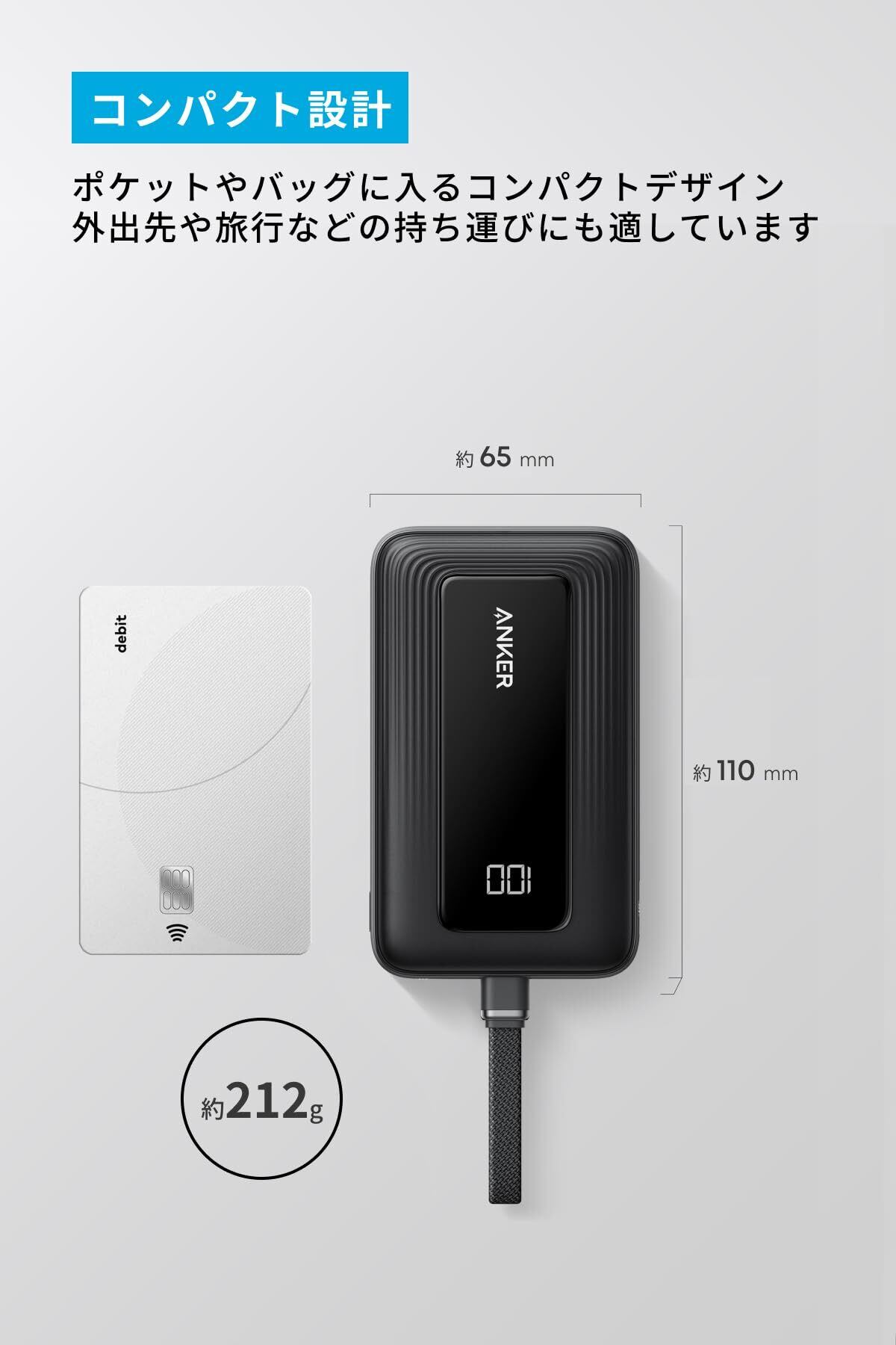 ケーブル一体型で、荷物がスッキリ:USB-Cケーブル一体型のため、外出先でもお使いの機器をいつでも充電可能です。約14cmの一体型ケーブルは約10,000回の折り曲げにも耐えられる優れた耐久性を実現しました。(Anker調べ)