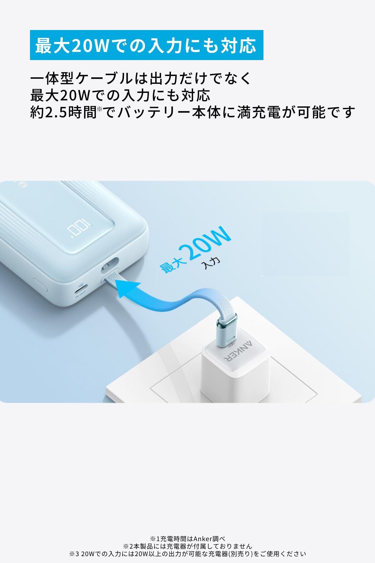 最大20Wでの入力にも対応:一体型ケーブルは出力だけでなく、最大20Wでの入力にも対応可能です。約2.5時間 でバッテリー本体に満充電が可能です。 ※20W出力のUSB急速充電器を使用して充電した場合(Anker調べ)