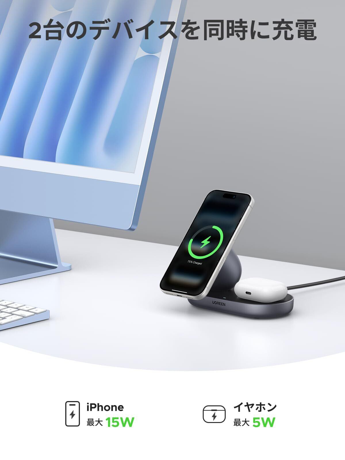 UGREEN Zapix ワイヤレス充電器 MagSafe 15W Qi2認証 2-in-1 イヤホン iPhone ワイヤレス充電 マグネット式 iPhone 17/16/15/14/13/12シリーズ & AirPods対応 1mケーブル付き