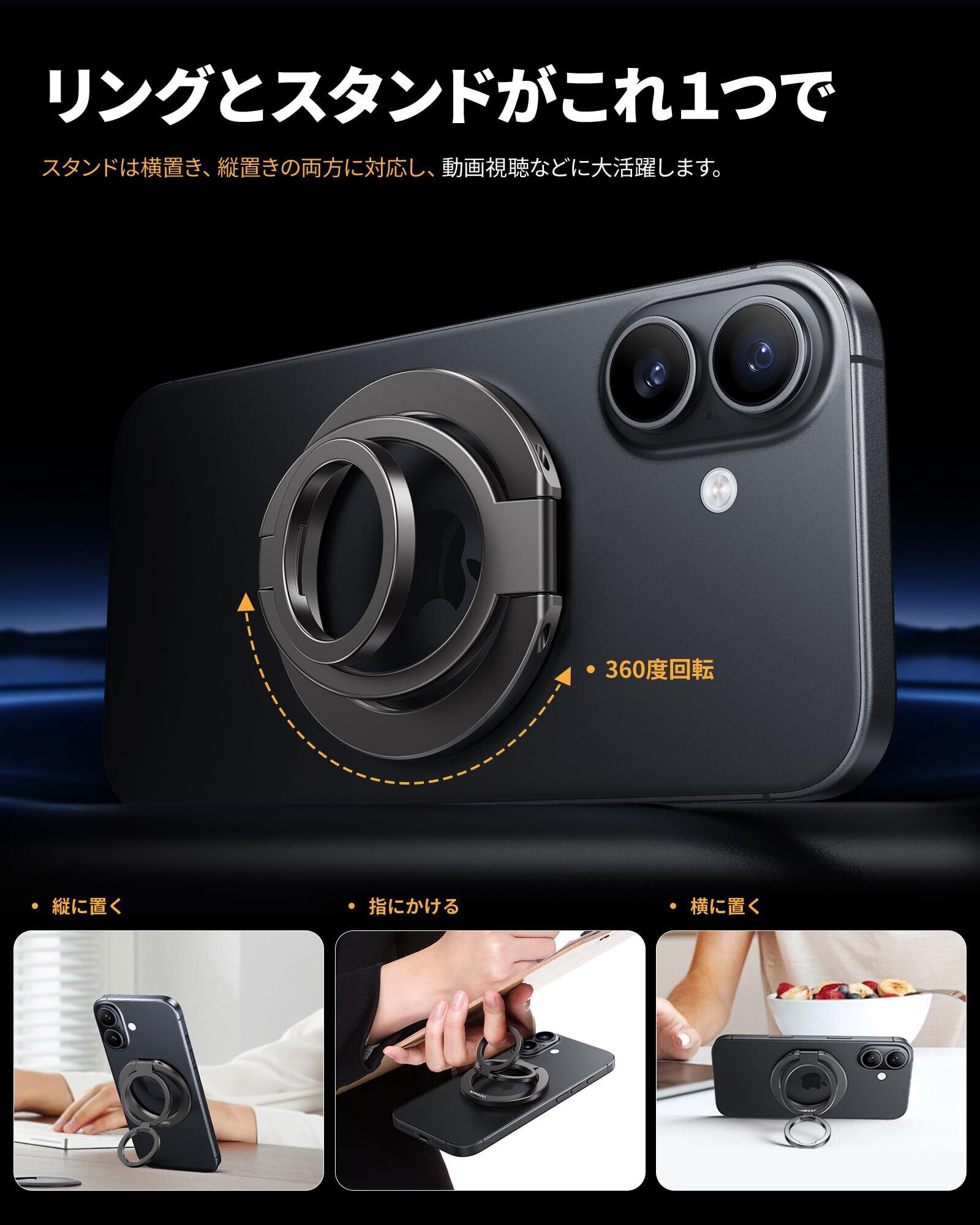 【スマホリング&スマホスタンド両用】リングに指を通せば片手で簡単にスマホを持つことができます。スマホが使いやすくなるだけでなく、思わぬ落下のリスクも軽減するので、混雑したバスや電車の中でも安心して使用できます。また、リングが自由自在に動くため、縦、横どちらの向きでも使用でき、卓上スタンドとしても使用できます。動画鑑賞やビデオ通話、自撮りなど、シチュエーションに合わせて最適な角度に調整できます。