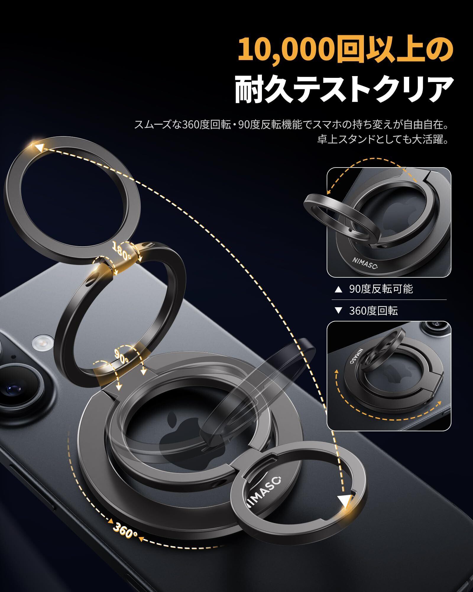 NIMASO スマホリング MagSafe対応 スマホリング マグネット式 スマホ落下防止 角度調整可能 金属リング付き iPhone17/16/15/12/11シリーズ、Androidなど全機種対応(ブラック)DZH25L1996