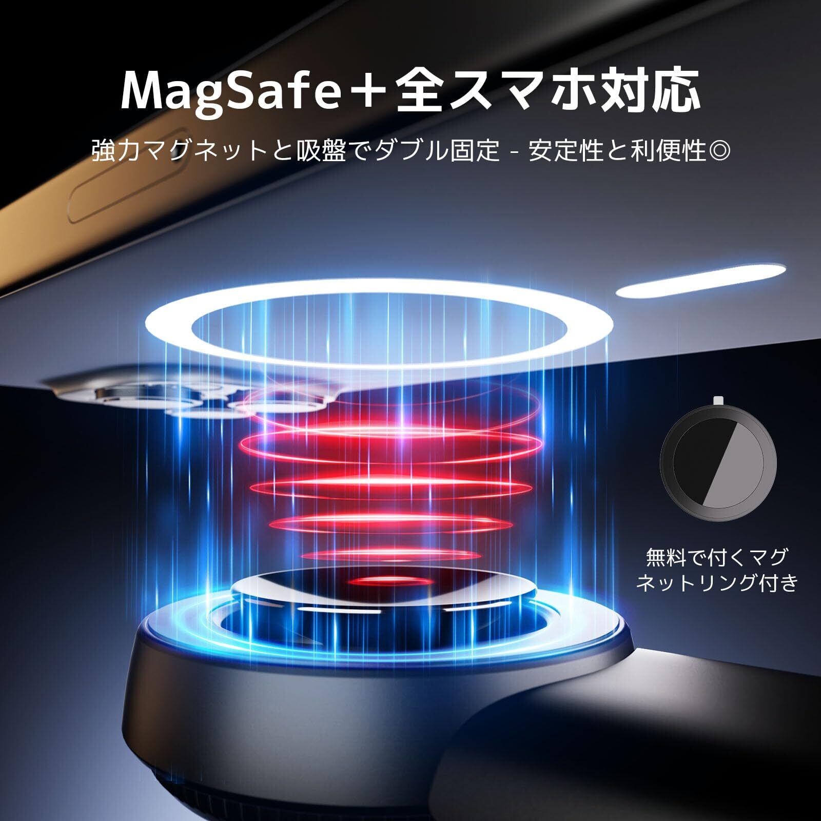 【幅広い互換性】上部のスマホ固定用ホルダーは、強力なマグネットと吸盤により、ダブル固定が可能であり、全てのスマホ機種に対応しています。また、下部のクランプは、 グリップできる最適な厚さが15-39mmであり、平坦な場所に固定することができます。MagSafe以外のスマホをご使用の場合は、付属のメタルリングを取り付けることで対応することができます。