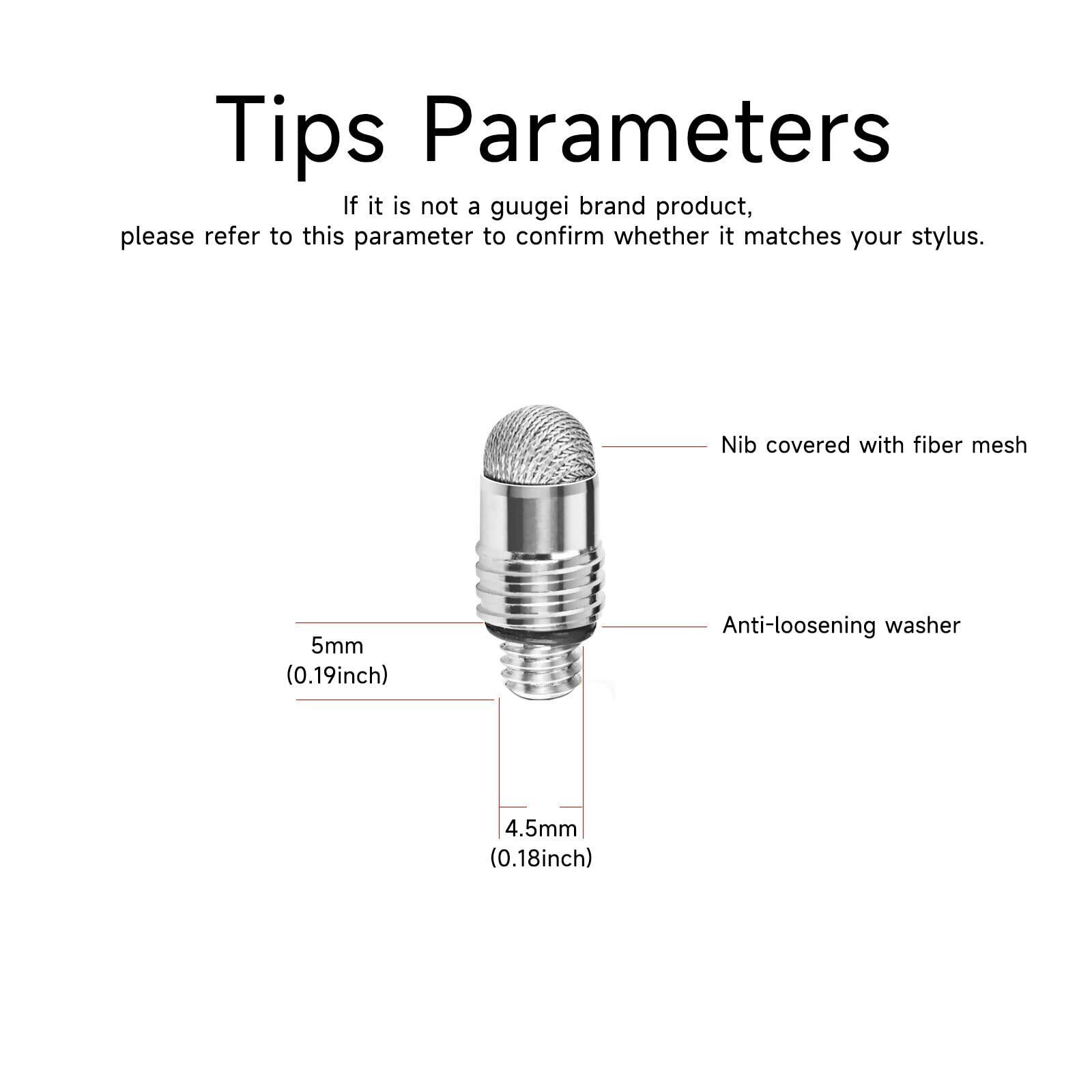 これらのチップは、GUUGEIモデルB091J7GG77、B0B6C74D78、B0BPSLVWZKなど、さまざまなスタイラスペンと互換性があります。 特定のサイズパラメータが用意されており、他のブランドにも適合し、ほとんどのねじ込み式スタイラスデザインに多目的に使用できます。