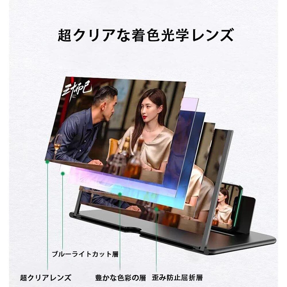 【2026アップグレード版・スマホ画面拡大鏡】本スクリーンアンプは高解像度の光学技術画面を採用しています、13インチ高解像度3Dのスマホ拡大鏡は、スマートフォンの画面を4から5倍に拡大でき、青い光線保護技術、歪みなしの高精細イメージを提供します。小さな画面による疲労を効果的に軽減できます。両手の束縛から解放され、携帯電話で映画、ビデオ、ニュースを簡単に見ることできます。