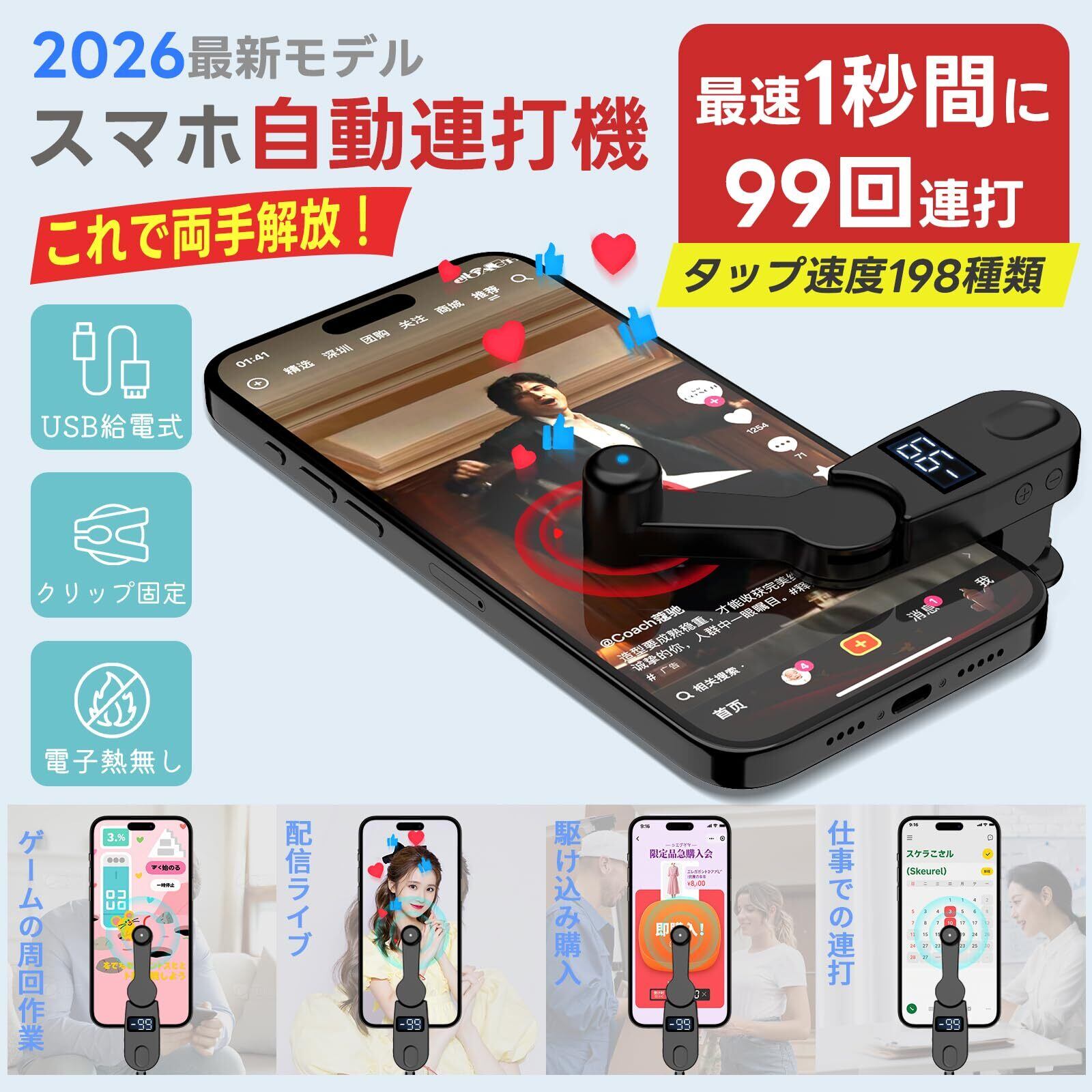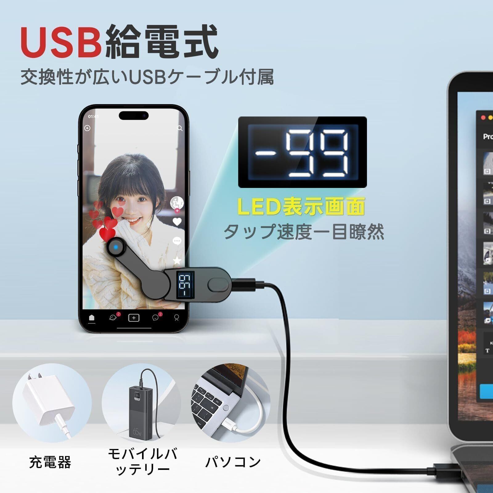 UYTON オートクリッカー 自動タップ機 スマホ 無音連打機 いいね スマホ連打装置 クリップ式 USB給電式 高速 スマッチ 装置 tiktok/ライブ/いいね/ハート/ゲーム周回作業/推し活 iPhone/Android/iPadに対応 (198種類タップ速度)