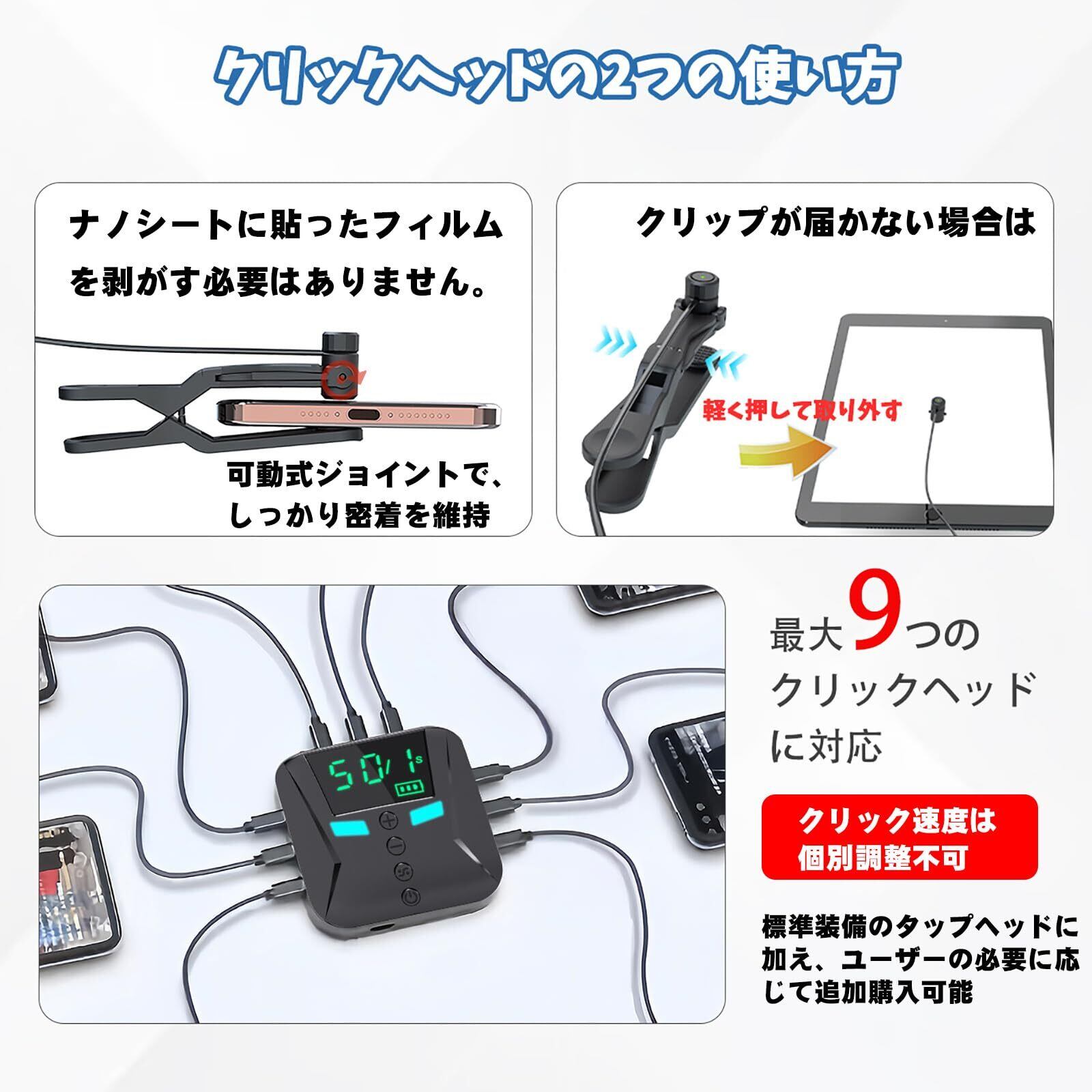 【多台使える】最大は9つのクリックヘッドが9台のスマートフォン/タブレットを同时にクリックすることに対応しています。 ご注意:工場出荷時に1台の本体は1つのクリックヘッドしか搭載されていないので、複数のクリックヘッドが必要な場合は必要に応じて別途ご購入ください。