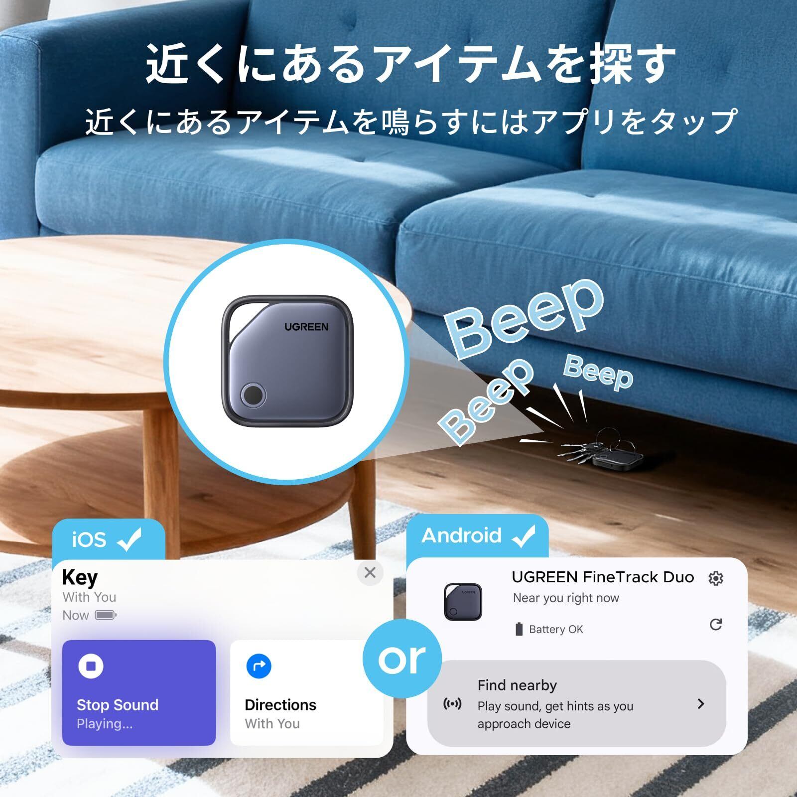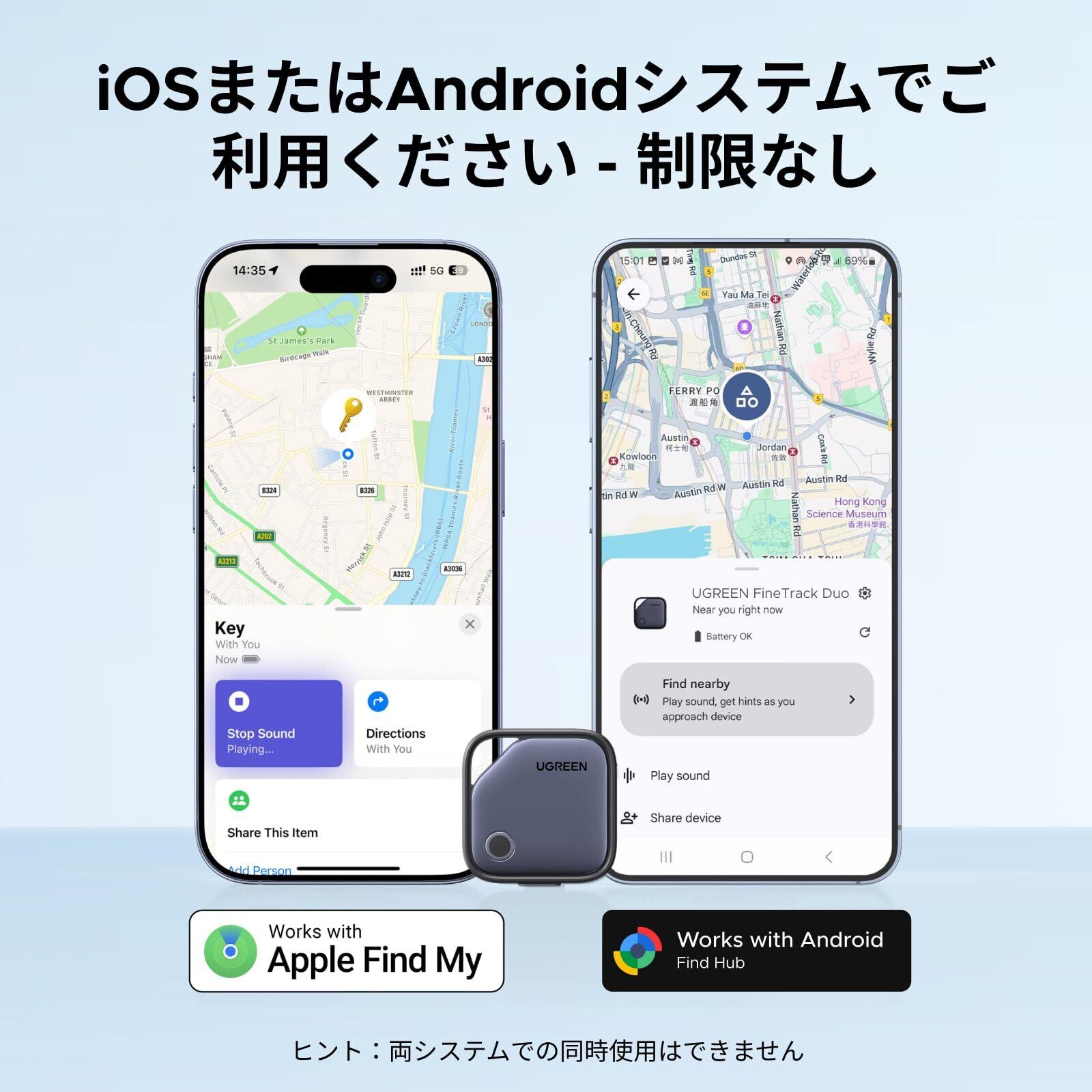 iOSまたはAndroidデバイスとの簡単検索&家族共有:FineTrack DuoタグをiPhoneやAndroid携帯電話とワンタップで素早くペアリング。Appleの「探す」アプリまたはGoogleの「Find Hub」アプリで、Air Trackerタグを「アイテム」タブに追加すれば、鍵や財布、その他の貴重品を即座に検索・追跡可能。家族とトラッカーの位置情報を共有すれば、皆でアイテムの安全を守れます。(※注:iOSとAndroid端末への同時ペアリングはできません。)
